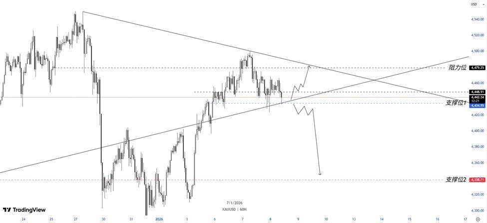 基本面与技术面在这一阶段形成了明显呼应,一方面,美国就业数据释放出的降温信号支撑了市场对2026年美联储继续宽松的预期,为黄 金中期逻辑提供托底;另一方面,美元指数的阶段性反弹与数据博弈又对金价构成短线扰动,使价格难以在缺乏新催化的情况下直接突破 技术压制。叠加地缘政治不确定性持续升温,在特朗普强硬政策风格主导下,全球风险溢价仍处于高位运行区间,黄金的避险属性并未削 弱,反而在回调过程中持续吸引中长期资金关注。总而言之,当前黄金并未进入趋势反转阶段,而是处于关键结构收敛与方向抉择的前 夜,4440美元得失将成为短线走势的重要分水岭,在该位置上方运行,市场更偏向震荡偏强并等待向上突破的机会;一旦有效跌破,则需 警惕回调向4338美元支撑区延伸的可能性,在方向正式明确之前,金价仍将维持高位震荡、节奏反复的运行特征。 从技术结构来看,当前金价正运行在一个收敛形态之中,上方受制于自前高回落形成的下降趋势线压制,下方则受到自年初低点抬升而来 的上升趋势线支撑,价格正逐步逼近关键交汇区域,波动率在压缩的同时,也预示着方向选择正在临近。短线而言,4440美元附近是当前 多空反复争夺的核心区域,该位置不仅对应前期密集成交区, ...