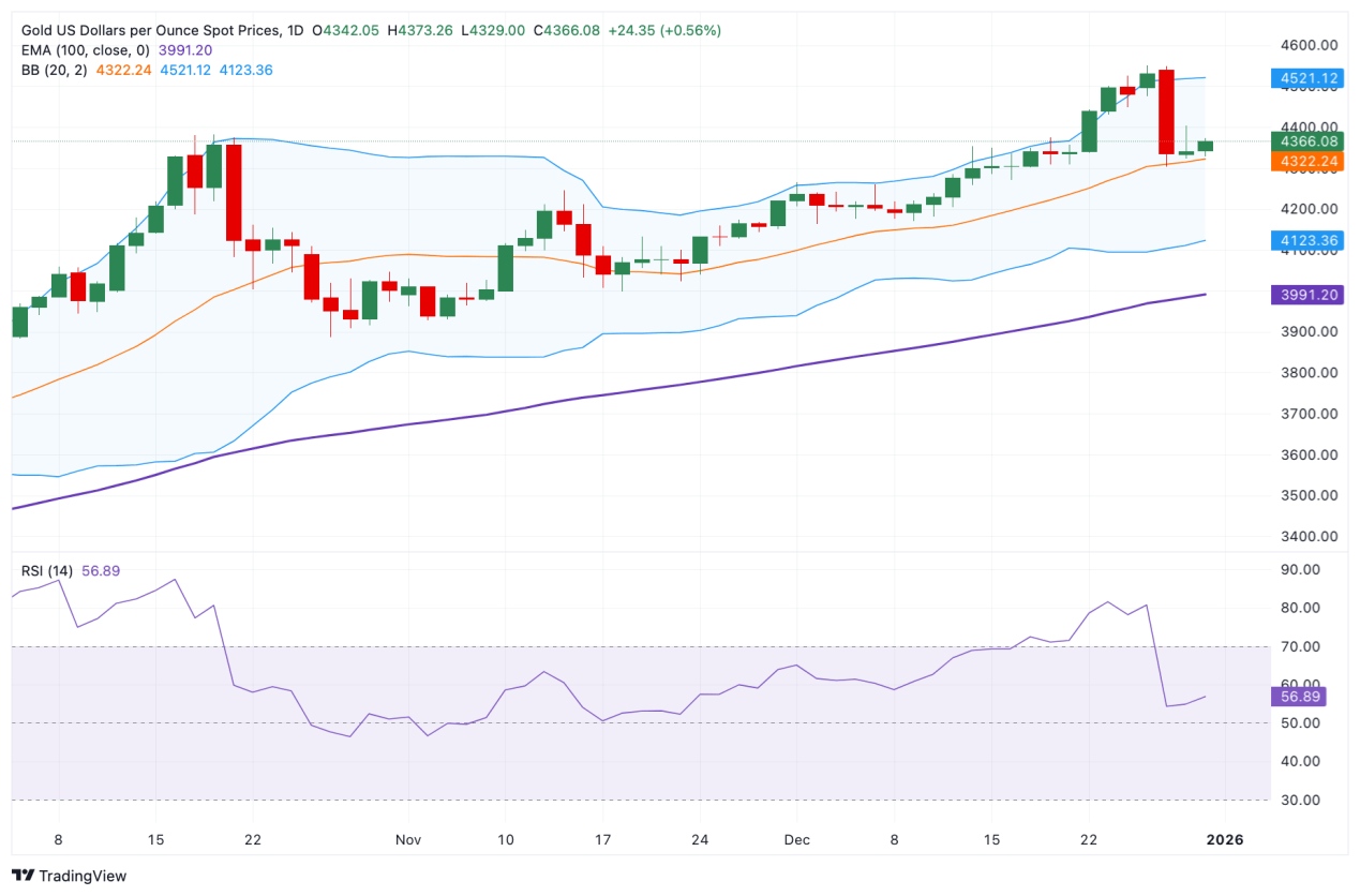 黄金在周三欧洲早盘时段延续涨势,突破每盎司4350美元。 今年以来金价已累计上涨约65%,有望创下自1979年以来最大年度涨幅。市场预期美联储可能在2026年进一步降息,这被视为支撑金价的主要因素。利率下 降通常会降低持有黄金的机会成本,从而对这类无息资产构成利好。 地缘政治风险也为黄金提供了一定支撑。持续存在的以色列-伊朗冲突以及美国与委内瑞拉之间的紧张关系,可能促使部分资金流向黄金等传统避险资产。 不过,黄金进一步上涨的空间可能受到部分因素限制。 阻力方面,首个关键水平位于布林带上轨4520美元附近,若突破则可能进一步上探4550美元前期高点及4600美元心理关口。支撑方面,4300-4305美元区域 构成初步防守,若失守则可能向下测试4271美元附近的前期低点。 从市场动态来看,美联储在近期会议上决定降息25个基点,将联邦基金利率目标区间下调至3.50%-3.75%。会议纪要显示,多数官员认为只要通胀持续回 落,进一步降息是合适的,但在降息时机和幅度上仍存在分歧。根据CME FedWatch工具,1月降息的概率目前小幅回落至约15%。 从技术分析角度看,黄金日线图显示价格仍处于100日指数移动均线上方, ...