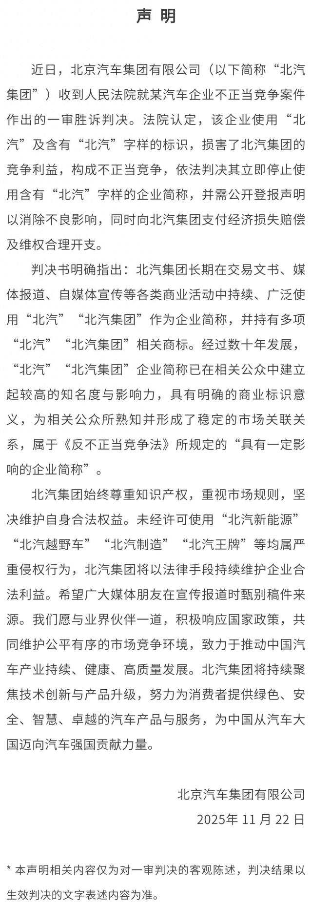 Core Viewpoint - Beijing Automotive Group emphasizes the importance of protecting its intellectual property rights and will take legal action against unauthorized use of its trademarks, including "BAIC New Energy," "BAIC Off-road Vehicle," "BAIC Manufacturing," and "BAIC Wangpai" [2] Group 1 - The company aims to maintain a fair and orderly market competition environment and is committed to promoting the sustainable, healthy, and high-quality development of the Chinese automotive industry [2] - Beijing Automotive Group focuses on technological innovation and product upgrades to provide consumers with green, safe, intelligent, and excellent automotive products and services [2] - The company expresses its intention to contribute to China's transition from a major automotive nation to a strong automotive nation [2]