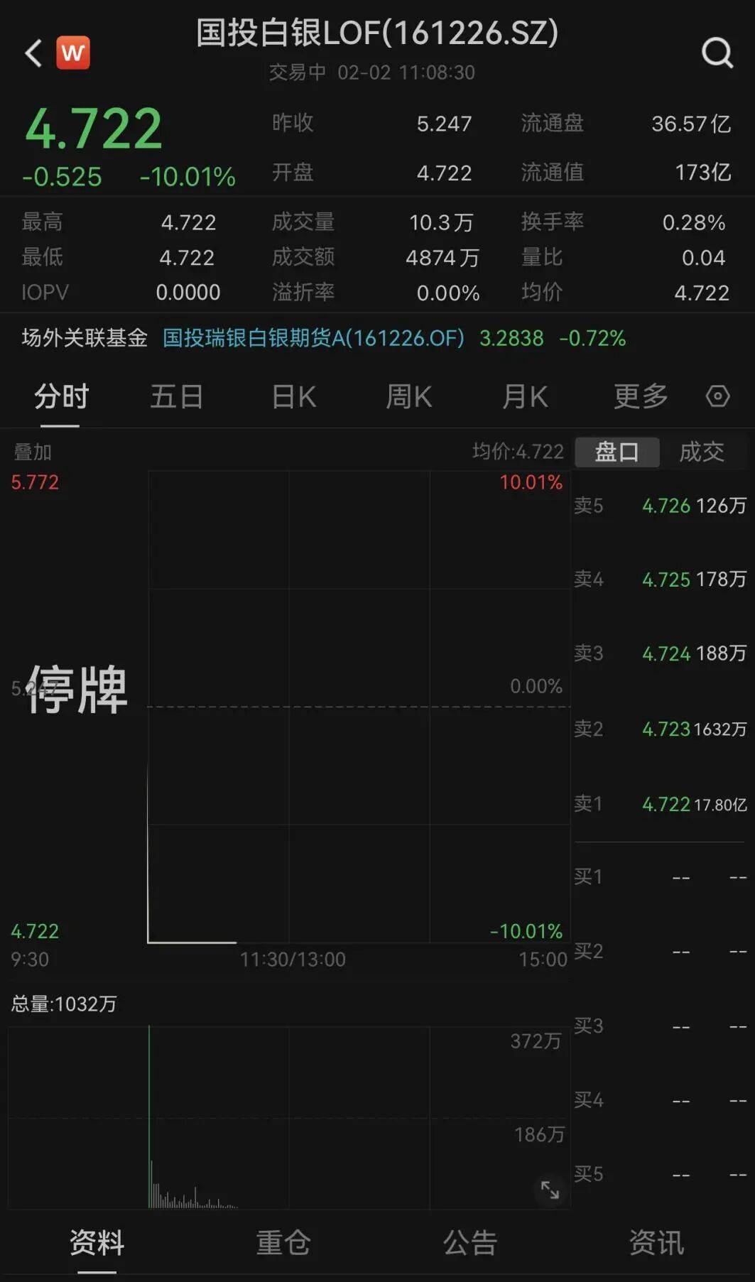【导读】国投白银LOF今日复牌后一字跌停 中国基金报记者 方丽 受国际银价暴跌影响,国投白银LOF今日复牌后一字跌停! | W | 国投白银LOF(161226.SZ) | | | | | | --- | --- | --- | --- | --- | --- | | | 交易中 02-02 11:08:30 | | | | | | 4.722 | | 昨收 | 5.247 | 流通盘 | 36.57亿 | | -0.525 -10.01% | | 开元 | 4.722 | 流通值 | 173亿 | | 最高 | 4.722 | 成交量 | 10.3万 | 换手率 | 0.28% | | 最低 | 4.722 | 成交额 | 4874万 | 量比 | 0.04 | | IOPV | 0.0000 | 溢折率 | 0.00% | 均价 | 4.722 | | | 场外关联基金 国投瑞银自银期货A(161226.OF) 3.2838 -0.72% | | | | | | 分时 | 五日 | 日K | 周K | 目K | 白天 | | 量加 | | | | 均价:4.722 | 盘圆 成交 | | 5.772 | ...