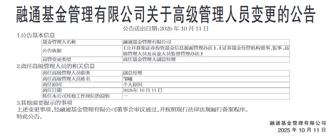 10月11日,融通基金发布高级管理人员变更公告,副总经理邹曦离任,离任日期2025年10月11日。此前9月已卸任景气A、成长A、融通产业趋势、A四只产 品基金经理,这位在融通基金工作了24年的元老级人物,最终挥手作别。 | 1:4047400 基金管理人名称 | 融通其金管理有限公司 | | --- | --- | | 公告依据 | 《公开募集证券投资基金信息披露管理办法》、《证券基金经营机构董事、监事、高 级管理人员及从业人员监督管理办法》 | | 高管变更类型 | 离任基金管理人副总经理 | | 2.离任高级管理人员的相关信息 | | | 离任高级管理人员职务 | 副总经理 | | 离任高级管理人员姓名 | 气的变 | | 料任原内 | 个人原因 | | 图任目期 | 2025年 10月 11日 | | 转任本公司其他工作岗位的说明 | | 24年老将邹曦正式离任 此前已卸任全部基金产品 邹曦的离任早在市场预料之中。就在一个月前的9月6日,他已卸任全部在管的4只基金产品,包括混合、混合、融通产业趋势和融通中国风1号灵活配置混 合。当时的一次性卸任所有基金,已被业内视为他将离开融通基金的明确信号。 邹曦是公 ...