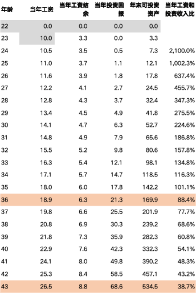 一直以来,我发现一个现象,那就是我们在绝大多数时候,对投资并没有给予足够的重视。今天,我想 来聊聊,为什么人们普遍不够重视投资? 正如司马迁在《史记》中所说:"天下熙熙,皆为利来;天下攘攘,皆为利往。" 投资这件事有多么重要?通过一个简单的模型,我们就可以知道。 答案可能让你吃惊:尽管这个人的储蓄率谈不上太高(只有1/3)、投资做得也一般般(每年15%对于 小资金来说实在谈不上太好的投资回报,要知道沃伦·巴菲特在规模很小的时候年均投资回报率超过 30%)、工资还在保持每年5%的稳定增长、而且也没有遭遇失业之类的倒霉事儿,但是只要到了36 岁,他的当年投资收入就会比工资还高,当年的工资收入和投资收入的比值为88.4%。 要知道,对于一个23岁工作、预计63岁退休(一共工作40年)的人来说,36岁仅仅开始了13年、也就是 1/3的职业生涯。但是,就在这个时候,这个人的工资,就已经赶不上他的投资了。 到了43岁、也就是整体工作年限达到50%的时候,这个人的当年工资和投资收入比值已经降至38.7%, 工资收入仅仅略多于投资收入的1/3。也就是说,在这时候,每年收入的4块钱里,就有将近3块钱来自 投资。 而且,以上的测 ...