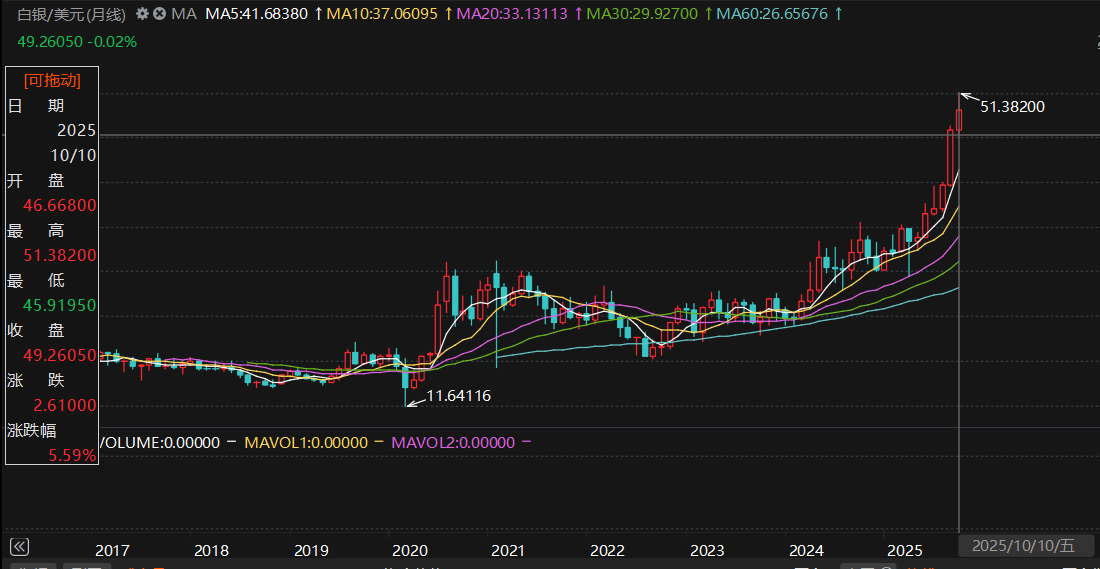 本报记者 许林艳 肖伟 据了解,当这些基本金属市场波动或价格低迷时,矿山开发意愿下降,会直接拖累白银的伴生供应。"即便银价上涨,矿 企也很难在短期内为白银单独扩大产能。白银的提炼还需要看冶炼企业的技术能力强弱和综合成本的高低。"陈湘军说道。 近段时间以来,贵金属的持续涨势引发市场广泛关注。黄金价格不断攀升之外,白银价格也屡创新高,且年内涨幅比黄金 更为强劲。 10月9日,现货白银价格突破50美元/盎司,为历史首次。10月10日,据东方财富Choice数据,白银开盘价报46.67美元/盎 司,最高达51.38美元/盎司,年内涨幅超70%。 浙商证券研报表示,当前白银的核心矛盾点在于趋势性减少的库存与贵金属牛市下日益提升的白银投资机会。 "当前,矿端供给已进入刚性区间,全球白银矿产供给目前面临增长瓶颈。2019年至2024年间,全球矿产银产量不仅没有 增长,反而略有下降。"湖南白银股份有限公司董秘袁志勇在接受《证券日报》记者采访时说道。据了解,这背后有两个核心 原因,一是矿石品位持续下滑,这意味着要获得同样多的白银,需要开采和加工更多的矿石,直接推高了单位生产成本。二是 全球矿端扰动频发,主要产区的大型银矿常受到 ...