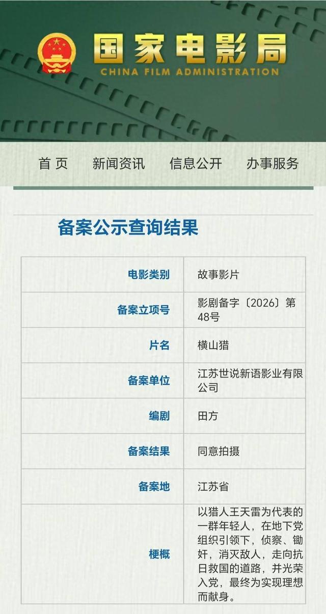 | 备案结果 | 同意拍摄 | | --- | --- | | 备案地 | 江苏省 | | | 以猎人王天雷为代表的 一群年轻人,在地下党 | | | 组织引领下,侦察、锄 | | 榎概 | 奸,消灭敌人,走向抗 | | | 日救国的道路,并光荣 | | | 入党,最终为实现理想 | | | 而献身。 | 电影《横山猎》获得国家电影局同意拍摄许可 转自:扬子晚报 该剧故事情节构思细腻,人物与事件设计巧妙,环环紧扣,在感情、爱情与大义面前,决然选择后者。 该剧还运用了历史遗迹、民俗民风、山景湖泊等为场景,再现出当年英雄们的壮举。 扬子晚报网 1月19日讯(记者 姜婧仪)根据土牛的同名长篇小说改编的电影剧本《横山猎》,近日,已 获国家电影局"同意拍摄"的许可。该剧是以抗战时期为历史背景,在江苏南京的江宁、溧水与安徽马鞍 山交界的横山地区,以猎人王天雷为代表的一群年轻人,在中共地下党组织和新四军的领导下,以各种 身份做掩护,巧妙、机智、灵活的消灭敌人,在侦察、除奸、伏击、传送情报等工作中,有力地协助了 新四军挺进大横山,建立新四军苏南游击队等方面,作出了重要的贡献,用一腔热血谱写出悲壮、爱国 的英雄诗篇。 中国新四 ...