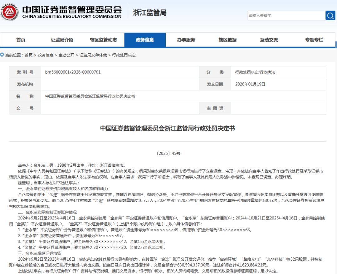 本报记者 冯思婕 综合全案事实,浙江证监局作出最终认定:金永荣公开荐股后实施反向交易,操纵市场主观故意明显,完全符合"抢帽子 操纵"行为特征。 1月19日,浙江证监局发布一份行政处罚决定书,认定雪球"大V"金永荣构成"抢帽子操纵"证券市场行为,对其罚没合计超 8300万元,并采取3年证券市场禁入措施。 根据处罚决定,金永荣被没收违法所得4162.39万元,并处以同等金额罚款,罚没总额合计8324.78万元。与此同时,金永 荣被采取3年证券市场禁入措施,禁入期间内,不得直接或化名、借他人名义,交易证券交易场所上市或挂牌的任何证券。 行政处罚决定书显示,金永荣出生于1988年,截至2025年4月,其雪球"金浤"账号粉丝数量超过10.7万人,2024年9月至 2025年4月期间发布帖文的单篇平均阅读量高达130万次,在证券投资领域具有较大知名度和影响力。 经查明,金永荣长期使用"金浤"账号在雪球平台发布荐股文章,并辅以在淘股吧、微信公众号、小红书等其他平台开通账 号发文发帖宣传,参与淘股吧实盘比赛以及直播分享选股逻辑等形式,积累名气和受众。 2024年9月2日至2025年4月16日,金永荣知晓其荐股行为具有影响力, ...