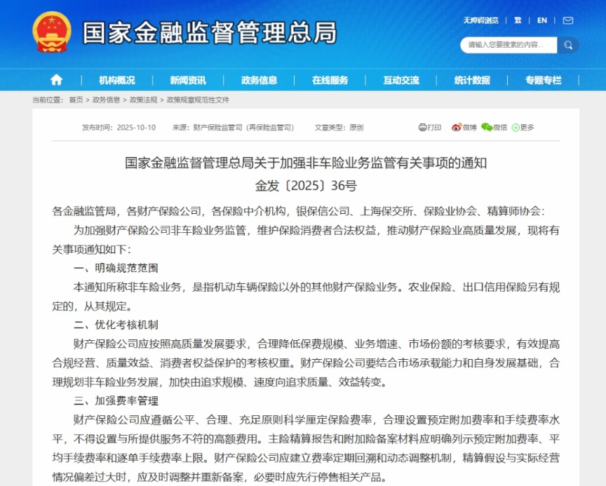 11月正式落地。 10月10日,金融监管总局发布《关于加强非车险业务监管有关事项的通知》(下称《通知》),要求财产保险公司优化对非车险业务的考核机制,规范产品 开发使用,强化保险费率管理,严格执行经备案的保险产品,推动非车险产品的使用符合备案内容。 这也意味着"报行合一"(即保险公司实际执行的保险条款和保险费率,要与向监管部门报送的备案材料保持一致,不得通过虚列费用、拆分保费等手段突破备 案标准)监管将全面延伸至非车险领域。相关规定将自2025年11月1日起实施。 《通知》还对财产保险公司的费率管理、条款费率使用、保险中介管理、经营管理费用、保费收入管理、批单退费管理等方面的内容作出进一步细化要求。 从追求规模、速度向追求质量、效益转变 《通知》所称的非车险业务是指机动车辆保险以外的其他财产保险业务,农业保险、出口信用保险另有规定的,仍从其规定。 根据国信证券研究报告数据,近年来,非车险业务持续扩容,在财产险总保费中的占比已从2019年的37.1%攀升至2024年的47.4%,贡献接近半数财险保费 规模。 规模增长的同时,承保亏损的现状也引发行业广泛关注。今年8月,在2025年中期业绩发布会上,中国人保副总裁 ...