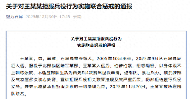 以下为通报详情—— 关于对王某某拒服兵役行为实施联合惩戒的通报 王某某,男,彝族,石屏县宝秀镇人。2005年10月出生,2025年9月从石屏县应征入伍,服役于北部战 区陆军某部。王某某入伍后,怕苦怕累,思想消极,以身体跟不上训练强度、不适应部队生活为由先后 4次提出退役申请。经部队、县征兵办、镇武装部及其家属多次谈心教育,宣讲拒服兵役相关政策法规 及其严重后果,仍然拒绝履行兵役义务,并表示愿意承担拒服兵役的一切法律后果。2025年11月20日, 王某某被所在部队除名。 王某某拒服兵役的行为性质严重,影响恶劣。为切实维护兵役制度的严肃性,巩固国防事业发展,警示 教育全县适龄应征青年,根据《中华人民共和国兵役法》《解决入伍新兵拒服兵役问题暂行办法》《云 南省征兵工作条例》等相关法规,对王某某拒服兵役的行为作出以下处罚: 2005年10月出生的王某某,入伍后怕苦怕累,思想消极,4次提出退役申请,经多次谈心教育,仍然拒 绝履行兵役义务,于11月20日被所在部队除名。 据"魅力石屏"微信公众号消息,云南省红河州石屏县政府征兵办于2025年12月30日通报称,王某某拒服 兵役的行为性质严重,影响恶劣,决定对其作出6项处罚 ...
