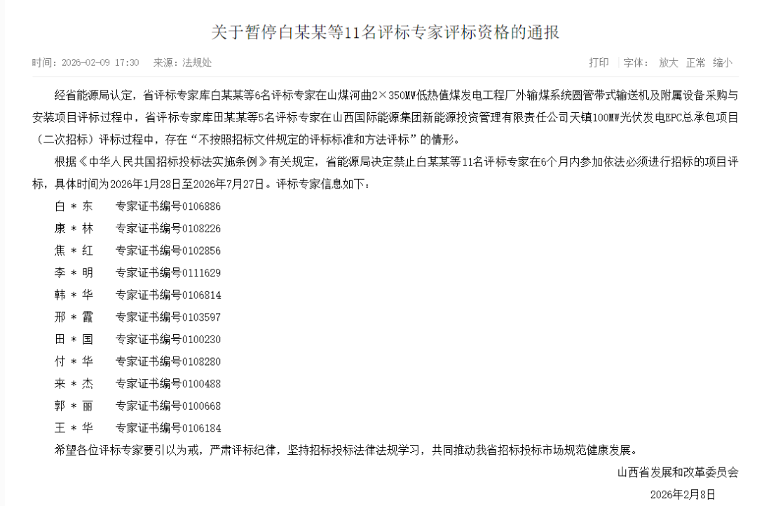 Group 1 - The Shanxi Provincial Development and Reform Commission announced that 11 bidding experts have been banned from participating in legally required bidding activities for six months due to failure to adhere to evaluation standards during project evaluations [1][4][6] - The Shanxi Provincial Energy Bureau identified that six experts, including Bai, did not follow the evaluation standards in the "Shanmei Hequ 2×350MW Low-heat Value Coal Power Plant External Coal Transportation System Procurement and Installation Project" [1][4][6] - The ban is effective from January 28, 2026, to July 27, 2026, as per the regulations of the Implementation Regulations of the Bidding Law of the People's Republic of China [1][4][6] Group 2 - The Shanxi Provincial Development and Reform Commission emphasized the importance of strict bidding discipline and continuous learning of bidding laws and regulations among bidding experts [1][4][6] - The commission aims to promote a standardized, healthy, and orderly development of the bidding market in Shanxi Province [1][4][6]