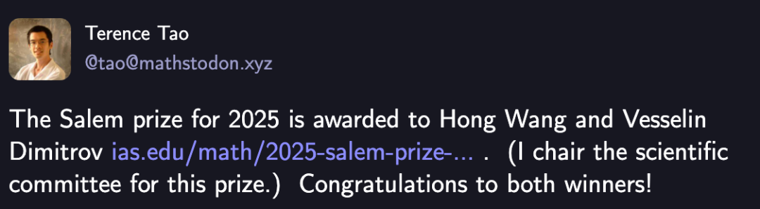 图:陶哲轩发文祝贺 值得一提的是,在该奖项颁布前日(10月27日),世界华人数学家大会ICCM数学奖金奖授予了邓煜、王虹和袁新意。 每经编辑|许绍航 10月28日,青年女数学家王虹拿下了2025塞勒姆奖。 据悉,塞勒姆奖被视为菲尔兹奖的风向标,从1968年到2024年的56位塞勒姆奖获奖者中诞生了10位菲尔兹奖得主,而菲尔兹奖是数学领域的国际最高奖项 之一。 在获奖名单公布之后,前塞勒姆及菲尔兹奖项获得者陶哲轩第一时间发文恭喜。 这意味着,短短两天内,王虹已连夺两大"菲尔兹奖"风向标奖项。 资料显示,王虹于1991年出生在广西桂林市平乐县沙子镇,2008年至2011年本科就读于北京大学,原本在北大地球与空间科学学院就读,后来转到了数学 科学学院;2014年王虹获巴黎综合理工学院工程师学位和巴黎第十一大学硕士学位;2019年获麻省理工学院博士学位;随后在普林斯顿高等研究院做博士 后。 图:ICCM数学将金奖获得者 据了解,世界华人数学家大会由丘成桐发起,每三年举办一次,像菲尔兹奖一样限定45岁以下,被称为"华人菲尔兹奖"。 图:青年数学家王虹,来源:中国妇女报 王虹曾任加州大学洛杉矶分校助理教授,纽约大学柯朗数 ...