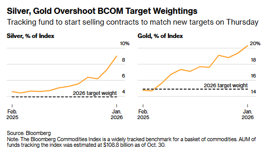 受大宗商品指数年度再平衡影响,交易商提前调整头寸,黄金、白银价格连续第二日走低。未来数日, 市场预计将有价值数十亿美元的贵金属期货合约被抛售。 现货黄金继前一交易日下跌近 1% 后,日内再度下探,跌破每盎司 4450 美元关口。被动型指数跟踪基 金自周四起开始抛售贵金属期货,以匹配指数调整后的最新权重要求。这一操作本属常规流程,但受去 年贵金属价格大幅飙升的影响,本次再平衡对黄金、白银的影响尤为显著。 周四白银价格跌幅超 3%,在本次再平衡中面临的抛售压力尤为突出。花旗集团测算,为满足指数再平 衡要求,市场或将抛售价值约 68 亿美元的白银期货合约,这一规模相当于纽约商品交易所(Comex) 白银期货未平仓合约总量的 12%。 花旗集团基于追踪彭博商品指数与标普高盛商品指数的基金数据测算,黄金期货的抛售规模预计与白银 大致相当。此次指数再平衡势在必行,根源在于贵金属在大宗商品基准指数中的权重占比已出现大幅攀 升。 彭博商品指数的调仓窗口期为每年首个交易日之后的第 6 个至第 10 个工作日,但指数成分权重调整对 应的实际交易操作,通常会提前一个工作日启动,且交易行为均匀分布在每年首个交易日之后的第 5 个 至 ...