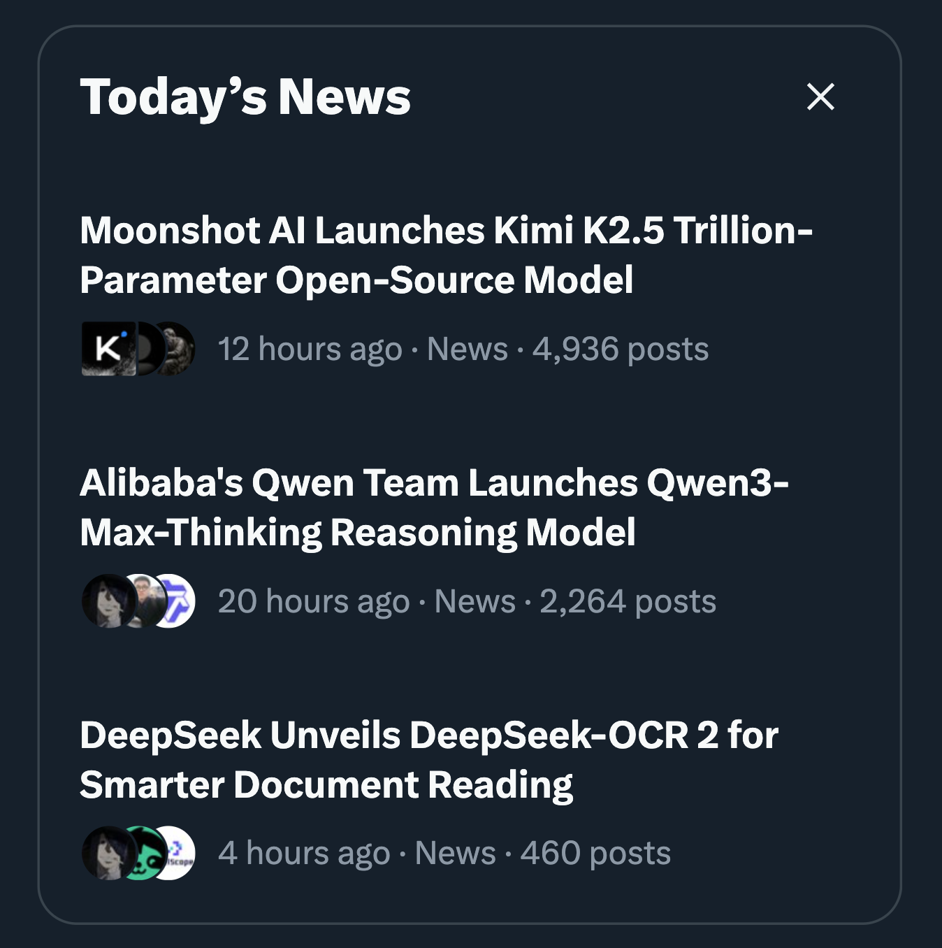 模型的盲目竞争阶段结束,进入以推理能力为主导的时代。 1月27日,DeepSeek与Kimi再次同日发布模型,此前已有数次模型与论文发布"撞车",足见行业关注度争夺之激烈。 Kimi官方将K2.5定义为公司迄今为止最智能的模型,包括Agent、代码、图像、视频及一系列通用智能任务表现;同时,这也是Kimi迄今最全能的模型,包 括原生多模态架构设计,同时支持视觉与文本输入、思考与非思考模式、对话与 Agent任务。 同日发布的DeepSeek-OCR2模型是去年10月官方推出的DeepSeek-OCR模型的迭代版本,团队采用了创新的DeepEncoder V2方法,让AI能够根据图像的含义 动态重排图像的各个部分,而不再只是机械地从左到右扫描,这种方式模拟了人类在观看场景时所遵循的逻辑流程。 近日,多家国产模型厂商更新模型进展,包括DeepSeek开源新的OCR 2模型、Kimi发布并开源Kimi K2.5模型、阿里发布千问旗舰推理模型Qwen3-Max- Thinking,头部模型的密集更新使中国模型在当日霸榜海外社交平台X的热点前三位。据一位行业人士透露,下周也有多款国产模型产品将更新发布。 2025年春节 ...