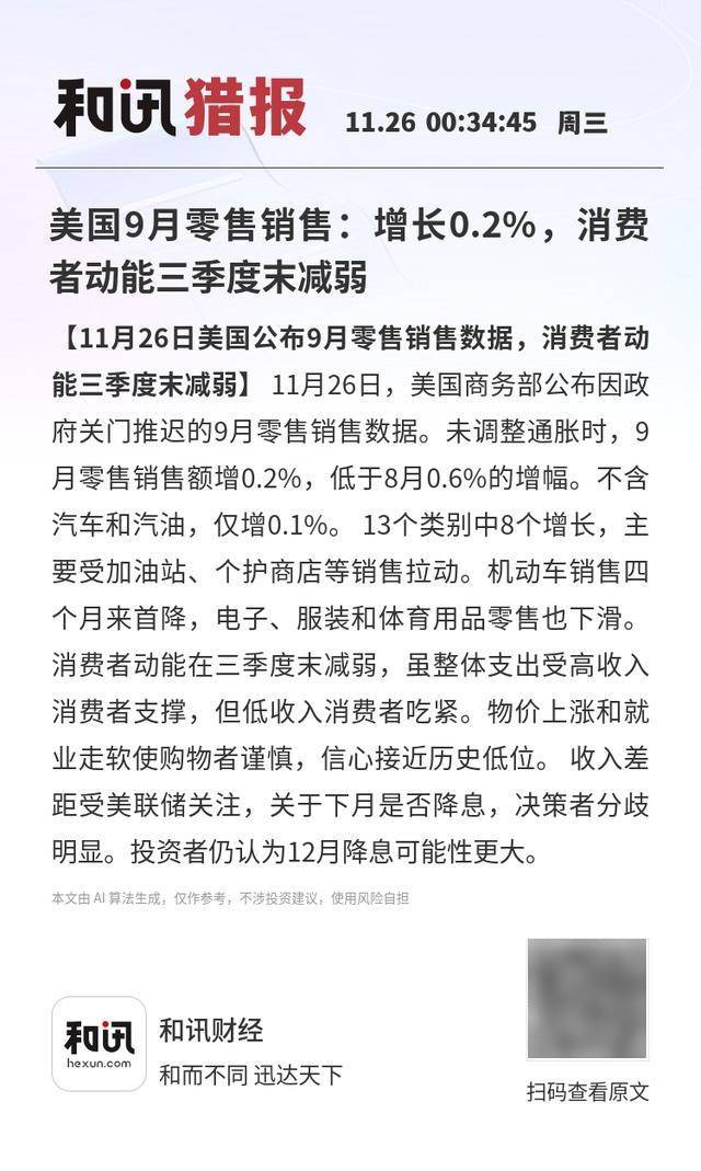 【11月26日美国公布9月零售销售数据,消费者动能三季度末减弱】11月26日,美国商务部公布因政府 关门推迟的9月零售销售数据。未调整通胀时,9月零售销售额增0.2%,低于8月0.6%的增幅。不含汽车 和汽油,仅增0.1%。 13个类别中8个增长,主要受加油站、个护商店等销售拉动。机动车销售四个月来 首降,电子、服装和体育用品零售也下滑。 消费者动能在三季度末减弱,虽整体支出受高收入消费者 支撑,但低收入消费者吃紧。物价上涨和就业走软使购物者谨慎,信心接近历史低位。 收入差距受美 联储关注,关于下月是否降息,决策者分歧明显。投资者仍认为12月降息可能性更大。 本文由 AI算法生成,仅作参考,不涉投资建议,使用风险自担 FOG hexun.com 和讯财经 和而不同 迅达天下 扫码查看原文 ...