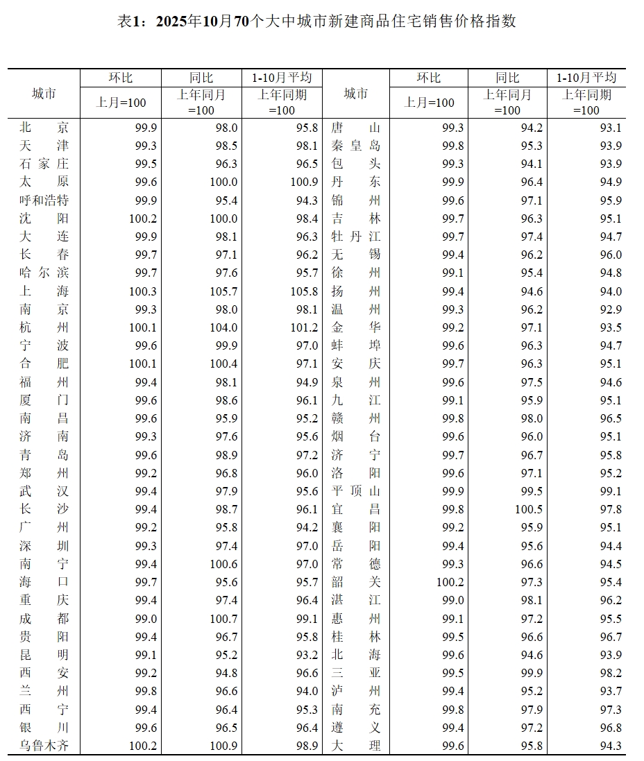 近日,国家统计局公布了2025年10月份70个大中城市商品住宅销售价格变动情况。数据显示,10月,70 个大中城市中,各线城市商品住宅销售价格环比和同比均下降。 值得注意的是,上海、乌鲁木齐、杭州、合肥等城市新房价格环比、同比均上涨。 58安居客研究院院长张波向《每日经济新闻》记者书面分析指出,一线城市改善型需求稳定,高库存中 小城市的房价下行压力依然存在,库存去化周期超20个月的城市,受房企"以价换量"冲刺业绩影响,新 房价格环比依然下行。总体来看,一线核心板块企稳、二线内部分化、三四线整体承压的态势并未发生 变化。 他判断,预计11月和12月,随着政策托底力度加大、房企年底冲刺,市场还将呈现"量稳价弱、分化持 续"的特征。 上海新房价同比涨5.7% 国家统计局城市司首席统计师王中华在解读数据时指出,10月份,一线城市新建商品住宅销售价格环比 下降0.3%,降幅与上月相同。其中,上海上涨0.3%,北京、广州和深圳分别下降0.1%、0.8%和0.7%。 二线城市新建商品住宅销售价格环比下降0.4%,降幅与上月相同。三线城市新建商品住宅销售价格环 比下降0.5%,降幅扩大0.1个百分点。 同比来看,上海新房价格 ...