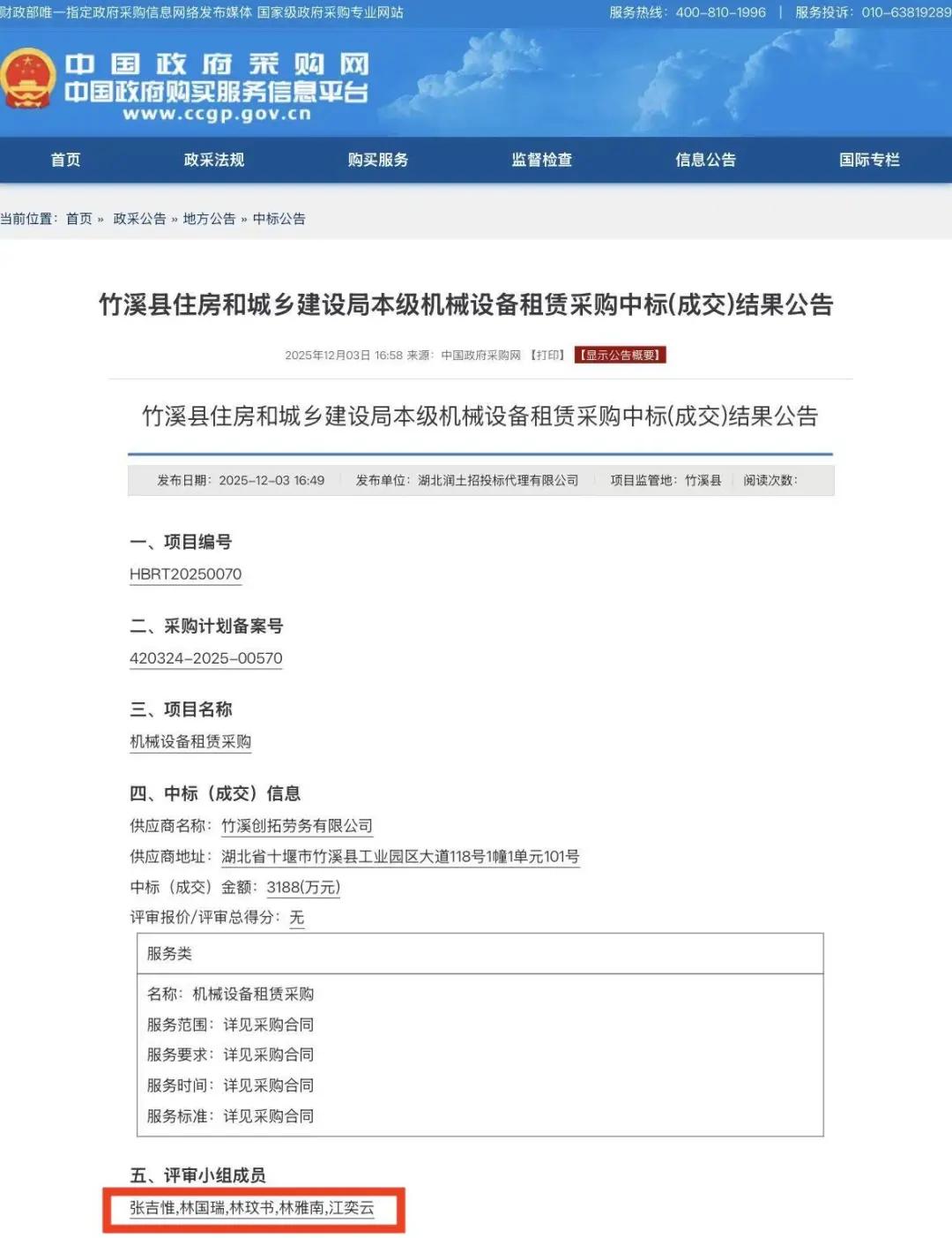 近日,湖北省竹溪县住建局"政府采购评审名单照搬百度人名大全"一事引发舆论热议。 在这份12月3日公布的《竹溪县住房和城乡建设局本级机械设备租赁采购中标(成交)结果公告》中,评审小组成员"张吉惟、林国瑞、林玟书、林雅南、江 奕云"5人与百度文库"10000中国普通人名大全"前5个名字完全重合。竹溪县往建局12月4日表示,对相关问题高度重视,现已终止该项目招投标程序,并 会同相关部门开展调查,将根据调查情况,依法依规处理。 财政部唯一指定政府采购信息网络发布媒体 国家级政府采购专业网站 服务执线:400-810-1996 服务投诉:010-63819289 HTT ディリム 监督检查 首页 政采法规 购买服务 信息公告 国际专栏 当前位置:首页» 政采公告»地方公告»中标公告 竹溪县住房和城乡建设局本级机械设备租赁采购中标(成交)结果公告 2025年12月03日 16:58 来源:中国政府采购网 【打印】 【显示公告概要】 竹溪县住房和城乡建设局本级机械设备租赁采购中标(成交)结果公告 发布单位:湖北润土招投标代理有限公司 项目监管地:竹溪县 阅读次数: 发布日期: 2025-12-03 16:49 一、项目编号 ...