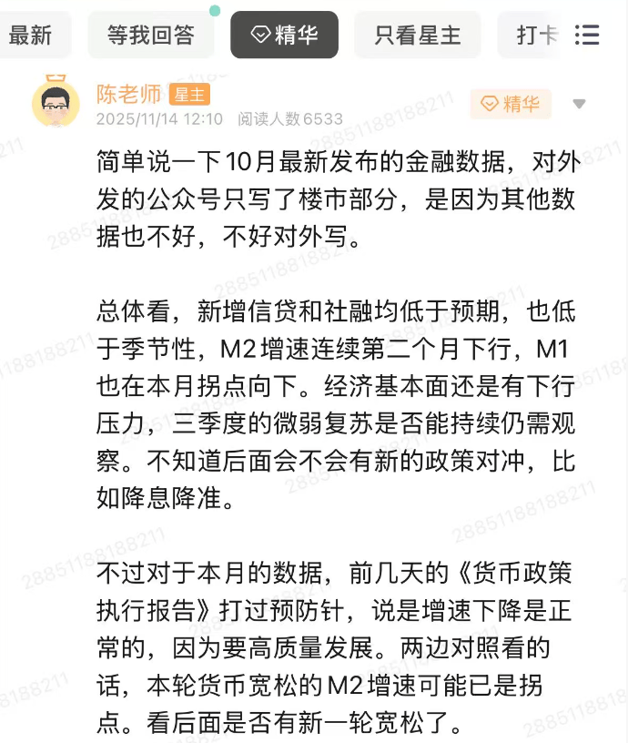 今天跌破趋势了,技术面上大概率可以确认上行市的结束,从技术面看,后续要么是震荡市,要么是下 行市。我个人倾向于震荡。 有关基本面的原因,我上周五在知识星球精华区发过帖,主要是10月的金融数据,导致支持股市上涨的 因素已不再。 既然7月之前的震荡阻力位是3500点,那么现在的3500点前后应该会有强支撑。但3500强支撑的意思, 并不是说市场一定会跌到这个点(担心有人误解,还是说清楚)。 我上周在该帖子的知识星球评论区也回答过该问题。 从基本面角度,当本轮数据证伪预期之后,市场可能会对新一轮政策保持期待和预期。具体要先看12月 的经济工作会议怎么说,然后才好预期下一轮的政策。 股市方面,倾向于震荡一段时间之后,如果未来有好的政策预期,明年可能还会存在再次上攻的机会。 公众号没对外发,是因为对外没办法对数据做偏空的解读,可能会被删文。因为去年12月遇到过一次对 数据看法不好而被删文的事情。 对于股市的影响,我个人倾向于震荡市,而非进入熊市。震荡的下沿暂时不好判断(后续我会结合多个 指标来寻找概率较大的点),但短期可以看的较强的支撑位,就是过去一轮震荡的上沿阻力位。 仓位管理方面,由于我在牛市是只卖不买的,所以卖出 ...