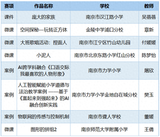 | 赛项 | 作品名称 | 学校 | 教师 | | --- | --- | --- | --- | | 课件 | 矿物与生活博物馆 | 江宁区曲磁区出山 | 王佳莹 | | 课件 | 唐画下班:AI赋能扁平化 | 南京市天印高级中学 | 张柳 | | | 与潮玩创作 | | | | 微课 | 画出你的数学故事 | 南京师范大学附属小学 | 潘成 | | 微课 | 鸡蛋饼中的数学 | 南京市金地自在城初级中学 | 王幸 | | 案例 | 创新实验室场景下生成式 人工智能在初中生物跨学 | 南京市致远初级中学 | 徐婷 | | | 科项目化学习中的实践 | | | 转自:扬子晚报 2025年"领航杯"江苏省教师数字素养提升实践活动近日落幕,南京市共有24位教师获奖。与上届赛事相 比,南京的获奖表现实现质的飞跃:特等奖数量翻倍增长,获奖总数更是实现2倍提升!祝贺以下获奖 老师! 特等奖 | 重师 | 作品名称 | 学校 | 教师 | | --- | --- | --- | --- | | 课件 | 庞大的家族 | 南京市汉 格小学 | 吴蓓蓓 | | 微课 | 空间探秘一玩转止方体 | 金陵中学浦口分校 | 直新 ...