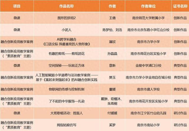 与上届赛事相比,南京市在省赛中特等奖数量翻倍,国赛中获奖总数全省第一。亮眼成绩的背后是系统 化培训的坚实支撑。过去一年,南京市电化教育馆(南京市教育信息化中心)深耕教师数字素养提升,构 建了"市级培训+区校送教+学科推广"的闭环培训体系。10余场专项培训吸引了1000余名骨干教师参 与,有效推动了数智技术深度融入课堂教学。 扬子晚报/紫牛新闻记者 王颖 校对 陶善工 转自:扬子晚报 在2025年全国中小学教师数字素养提升实践活动中,南京市共10件作品获得国家级奖项,总数全省第 一,创造历史最好成绩! | 项目 | 作品名称 | 作量 | 作者单位 | 证书名称 | | --- | --- | --- | --- | --- | | 微 | 图形的拼组2 | 王倩 | 南京师范大学附属小学 | 创新作品 | | 微观 | 小泥人 | 陈梦怡、刘浩 | 南京市北京东路小学红山分校 创新作品 | | | 融合创新应用数学案例 | Al跨学科融合 | 屠欣 | 南京市力学小学 | 创新作品 | | | 《口语交际 找最喜欢的人物形象》 | | | | | 融合创新应用教学室例 | 有趣的剪纸一 一剪纸团花 | 孙晶晶 ...