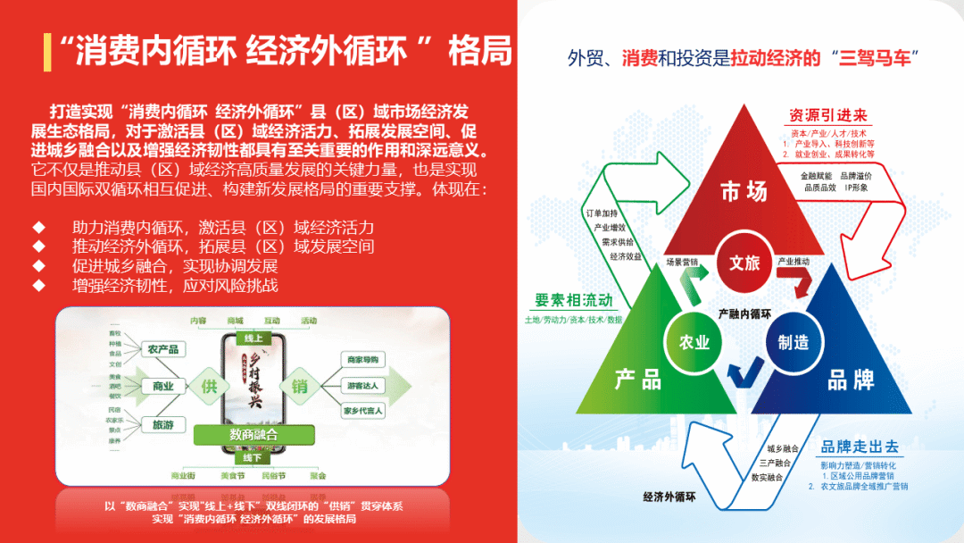 乘"数"而上,向"新"而兴,"数商"融合,以"质"致远。 图:"消费内循环 经济外循环"数商融合生态发展格局 图:数商融合智能创新服务中心——县(区)域经济高质量发展动力引擎 京地合作,通过联合落地建设"数商融合智能创新服务中心"基座,以人工智能+为方向,"科技赋能、数商融合、提振消费、服务地方" 为核心,运用新质生 产力,利用"数商融合服务云平台"、"AI数字创意平台"、"AI智播创新服务中心"、"IP形象伴游精灵AI智能体"、"惠民消费节"等具体载体,推动消费新业态 新模式新场景建设,将"农、文、旅、体、康、教、商"资源要素流通串点成线,营造"吃、住、行、游、购、娱"一体化区域消费场景"商业经济可信数据空 间",实现"消费内循环 经济外循环"的"双循环"生态发展格局,因地制宜打造"GBC数商融合"地方经济高质量发展模式,使地方政府(G端)与企业商家(B 端)、消费者(C端)多方共赢。 图:数商融合智能创新服务中心——数商融合服务云平台 图:数商融合智能创新服务中心——AI数字创意平台 14:12 ■ ▲ 元界主播 6 6 2 0 # 图 背景 1 2 6 1 微信扫码 上传资源 添加背景 I 0 th 2 ...