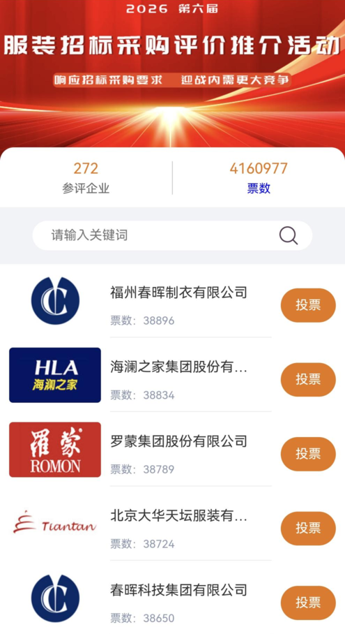 截至1月22日9:40分,网上共展示272家参评企业,总票数 4160977 票,得票前10名如下: 当前,服装企业参与招投标市场高度聚焦于团体性、功能性和特定制式需求,呈现以下特点:一是市场 细分明确。主要需求来自政府及企事业单位的制服采购(如执法、政务、校服)、军队被装、大型活动团 体服装及劳保工装。民用零售市场极少涉及招投标;二是资质与标准为先决条件。招标方对生产资质 (如特种劳动防护用品安全标志)、质量体系认证、面料安全环保检测报告等有严格要求。对于制服,还 需符合国家或行业的明确制式、颜色与工艺标准;三是竞争要素多维化。招标普遍采用综合评估法。价 格虽是关键因素,但产品品质的稳定性、交付工期保障、大批量生产的供应链能力、售后服务(如调 换、修补)同等重要。具备设计研发能力,能在标准框架内提供优化方案的企业更具优势;四是行业存 在一定的区域或行业壁垒(如军队供应商名录)。当前趋势强调功能性提升(如透气、防静电)、材料绿色 环保以及运用数字化技术实现精准量体与生产。与大型集团客户建立长期战略合作关系,是企业稳定获 得订单的核心途径。 为助力优秀诚信的服装供应商进一步提升品牌价值和强化品牌优势,在招标采购 ...