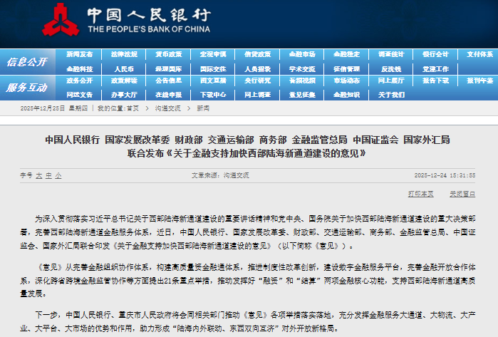 央行等八部门联合发布“21条”金融举措,力挺西部陆海新通道建设