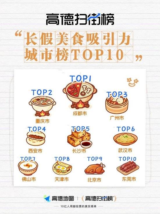 10月9日,高德扫街榜发布《2025国庆中秋长假出行消费报告》,数据显示,8天长假期间该平台为线下 餐饮门店引流超1亿人次,其榜单功能用户数23天内突破4亿。 丽江、乐山等10城入选"烟火城市榜",成都、重庆等20城包揽"美食吸引力城市榜"前20,且与"景点吸 引力城市榜"重合率达75%,"美食+美景"已成为游客出行的核心决策因素。 长假期间,高德APP单日活跃用户数峰值突破3.6亿,导航总里程超90亿公里。其"鹰眼守护"系统发出 17.4亿次安全提醒,新能源车1000公里以上位移次数同比增640%,数智化服务支撑了24.32亿人次的跨 区域流动,出行服务与消费场景的深度融合。 来源:封面新闻、新浪财经 (编辑:意欢) 报告指出,高德扫街榜凭借"烟火小店""本地人爱吃"等子榜单,迅速积累用户规模,其《全国TOP100 餐厅》人均消费均值83元,榜首广西北海越乡小厨人均仅98元,"好吃不贵"成为消费者优先选择标准。 高德扫街榜发布长假全国"游客喜欢的美食餐厅",天水哈海英麻辣烫、淄博八大局烧烤、香港华嫂冰室 排名前三。哈海英麻辣烫在天水"本地人爱去"榜上排名第二,八大局烧烤在淄博"轮胎磨损(专程前 往)"榜上排 ...