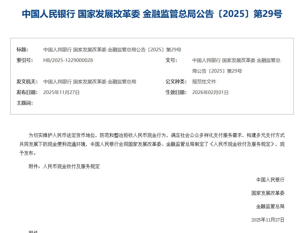 注意! 2026年2月1日起 人民币现金收付新规正式施行 | 标题: 中国人民银行 国家发展改革委 金融监管总局公告〔2025〕第29号 | | | | --- | --- | --- | | 索引号: | HB/2025-1229000028 | 文号: 中国人民银行 国家发展改革委 金融监管总 | | | | 局公告〔2025〕第29号 | | 发文机关: 中国人民银行 国家发展改革委 金融监管总局 | | 公文种类: 规范性文件 | | 发布日期: 2025年11月27日 | | 生效日期: 2026年02月01日 | | 主題词: | | | 为切实维护人民币法定货币地位,防范和整治拒收人民币现金行为,满足社会公众多样化支付服务需求,构建多元支付方式共同发展下的现金便利流通环 境,中国人民银行会同国家发展改革委、金融监管总局制定了《人民币现金收付及服务规定》,自2026年2月1日起施行。 《规定》对收费单位和经营主体的现金收付行为作了哪些规定? 《规定》基于分类管理和普遍适用的原则,提出保障现金支付的基本要求。主要包括以下几方面: 一、采取人工方式收款、提供面对面服务以及线上预约、交易,线下完成服务或 ...