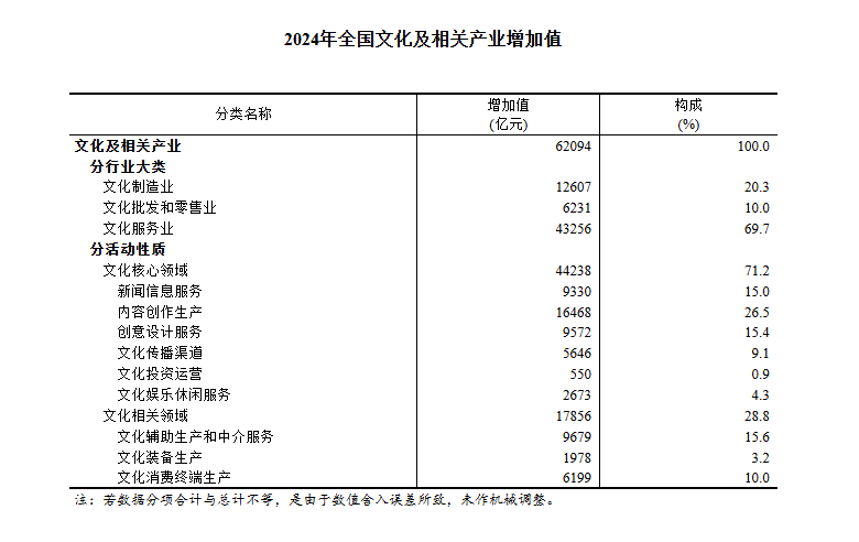 分领域看,2024年,文化核心领域增加值为44238亿元,占文化及相关产业增加值的比重为71.2%;文 化相关领域增加值为17856亿元,占比为28.8%。 2024年全国文化及相关产业增加值 分类名称 增加值 (亿元) 构成 (%) | 文化及相关产业 | 62094 | | --- | --- | | 分行业大类 | 100.0 | | 文化制造业 | 12607 | | 文化批发和零售业 | 20.3 | | | 6231 | | 文化服务业 | 10.0 | | | 43256 | | | 69.7 | | 分活动性质 | | | 文化核心领域 | | | | 44238 | | 新闻信息服务 | 71.2 | | | 9330 | | | 15.0 | | 内容创作生产 | 16468 | | | 26.5 | | 创意设计服务 | | | | 9572 15.4 | | 文化传播渠道 | | | | 5646 | | | 9.1 | | 文化投资运营 | 550 | | | 0.9 | | 文化娱乐休闲服务 | | | | 2673 | | 文化相关领域 | 4.3 | | | 17856 | | ...