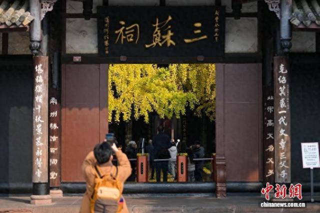 11月24日,初冬暖阳下,四川省眉山市东坡区纱縠行南街的三苏祠博物馆南门内,高大的银杏树渐染金 黄,金黄叶片随风轻舞,吸引不少游客驻足观赏、拍照留念,现场洋溢着浓浓的诗意与雅致氛围。图为 三苏祠南大门口一名游客正用手机拍照留念。中新社记者 刘忠俊 摄 11月24日,初冬暖阳下,四川省眉山市东坡区纱縠行南街的三苏祠博物馆南门内,高大的银杏树渐染金 黄,金黄叶片随风轻舞,吸引不少游客驻足观赏、拍照留念,现场洋溢着浓浓的诗意与雅致氛围。图为 三苏祠内上百年的古银杏树渐染金黄。中新社记者 刘忠俊 摄 11月24日,初冬暖阳下,四川省眉山市东坡区纱縠行南街的三苏祠博物馆南门内,高大的银杏树渐染金 黄,金黄叶片随风轻舞,吸引不少游客驻足观赏、拍照留念,现场洋溢着浓浓的诗意与雅致氛围。图为 三苏祠内游客用手机拍摄暖阳下的金黄银杏树。中新社记者 刘忠俊 摄 11月24日,初冬暖阳下,四川省眉山市东坡区纱縠行南街的三苏祠博物馆南门内,高大的银杏树渐染金 黄,金黄叶片随风轻舞,吸引不少游客驻足观赏、拍照留念,现场洋溢着浓浓的诗意与雅致氛围。图为 空中俯瞰三苏祠古建筑和渐染金黄的古银杏树。中新社记者 刘忠俊 摄 11月24日,初冬 ...
