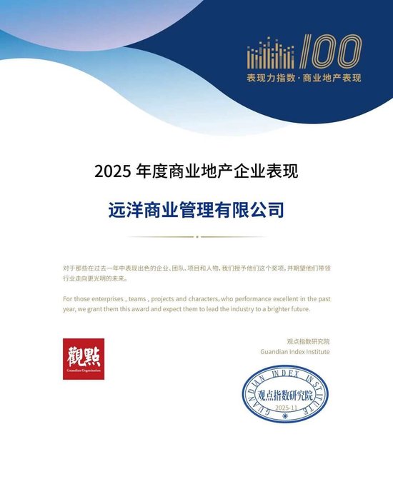 11月12日,远洋商业受邀出席《观点》举办的"向上的信心——2025商业年会",凭借专业的运营能力与 持续创新的发展表现,位列"2025年度商业地产创新能力表现20强"第十,并入选"2025年度商业地产企 业表现"榜单,旗舰项目武汉远洋里获评"2025城市地标综合体年度典范表现项目"。远洋商业公司总经 理孔繁琢在"商业的信心"主题讨论环节分享了远洋商业在轻资产领域的实践路径与思考。 远洋商业在不同市场阶段识别机遇、沉淀能力,并逐步构建起专业化的运营管理体系,特别是在城市综 合体与非标商业领域,积累了深厚的开发与运营经验。面对存量盘活时代的到来,远洋商业提供涵盖资 产诊断、资产盘活、价值修复的全周期解决方案,助力资产价值提升,通过充分研判市场趋势、结合投 资人诉求与项目独特基因,在项目"投、融、建、管、退"各环节,输出专业价值。 远洋商业 作为武汉远洋归元寺综合体的商业业态,远洋里的此次获奖,进一步印证了远洋商业对行业新趋势的敏 锐把握。项目跳出传统商业框架,以文商旅融合的开放街区为形态,在归元寺旁构建出一处历史与现代 交织的独特商业场域。通过策展式运营思维,远洋里将文化内容融入空间场景,使建筑、品牌与体验有 ...