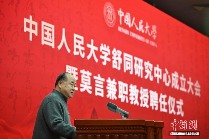 莫言受聘为中国人民大学兼职教授 中新网北京11月25日电 (记者 曾玥)中国人民大学舒同研究中心成立大会暨莫言兼职教授聘任仪式25日 在北京举行。中国作家协会副主席、诺贝尔文学奖获得者莫言受聘为中国人民大学兼职教授,中国人民 大学校长林尚立为其颁发聘书。 中国人民大学党委书记张东刚在致辞中表示,学校成立舒同研究中心、聘任莫言先生为兼职教授,是践 行高校使命、植根中华文明、以红色资源激发文化创新创造活力的扎实行动。我们将支持莫言先生依托 学校人才优势和学科优势,持续播撒文学创造、人才培养、文艺研究的火种,让更多"为人民而艺术"的 精品力作从人大出发、走进人民、走向世界。 "广采博取,融汇贯通。标新立异,变化无穷。藏头护尾,逸转从容。屈之为舒,和而不同。"在致辞 中,莫言用32个字凝练"马背书法家"舒同的作品和为人。他表示,舒同的书法在继承中华优秀书法艺术 精华的同时融入了强烈的个人特色,满含其作为革命家、书法家独具的胆魄与不断求新求变的意识,为 新中国书法事业的发展与书法艺术的普及作出了重要贡献。 11月25日,中国人民大学舒同研究中心成立大会暨莫言兼职教授聘任仪式在北京举行。图为中国作家协 会副主席、诺贝尔文 ...