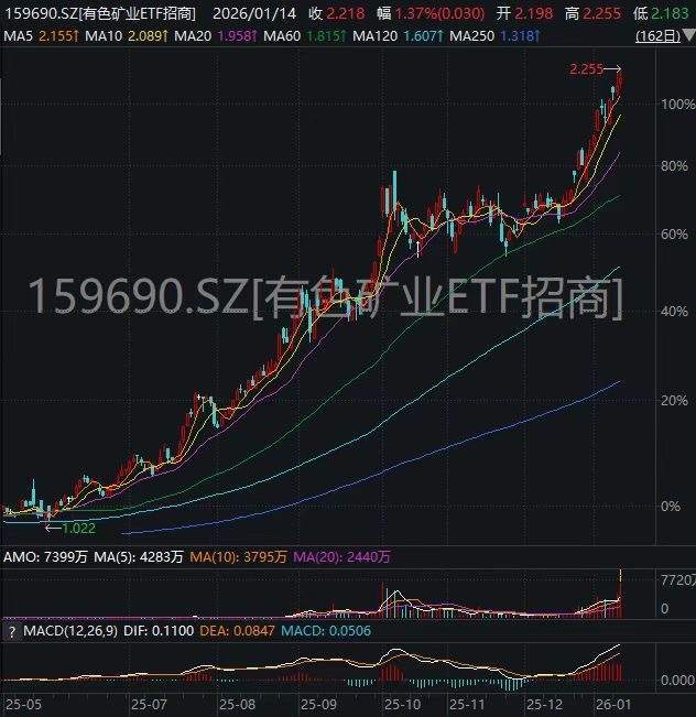 作为聚焦上游资源领域的投资工具,矿业ETF(159690)覆盖金银铜锂稀土等多种战略性资源,前三大权 重品种占比近六成。该ETF通过集中投资上游资源龙头,在有色金属价格上涨时展现出显著的价格弹 性,净值涨幅往往数倍于商品本身,被誉为"周期放大器"。随着全球制造业周期企稳回升,以及新能 源、人工智能等新兴产业对上游资源的需求持续增长,矿业板块的中长期投资价值值得重点关注。 1月14日,有色板块持续强势。数据显示,截至13时38分,"周期放大器有色矿业ETF招商(159690)放量 涨1.23%冲击四连升。成分股湖南白银、白银有色、兴业银锡、锡业股份涨幅居前。 分析称,本轮板块走强源于坚实的供需基本面支撑。供给端,全球主要有色金属品种面临矿山品位下 降、资本开支不足等长期约束,地缘政治因素进一步加剧供应不确定性。需求端,新能源产业快速发展 带动锂、钴等战略金属需求增长,制造业复苏推动小金属需求回升。 多家机构近期集中看好资源板块。中信证券建议适度增加有色等顺周期行业仓位,认为这些行业具备较 好的风险收益比。招商证券指出,2026年将迎来中美周期共振,有色是当前重点布局的顺周期选择。中 信建投更明确表示,资源品很可 ...
