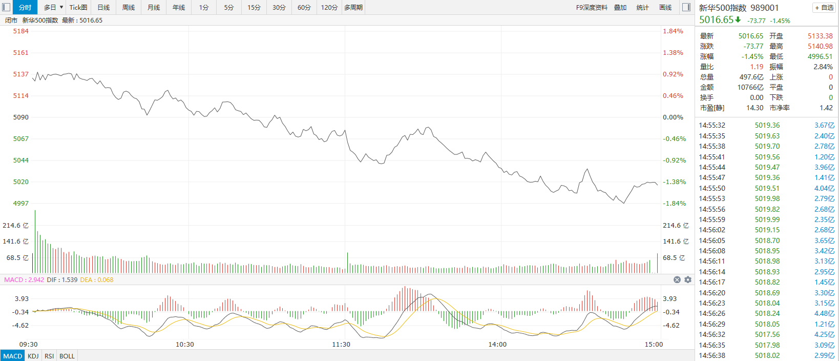 指数盘中最高触及5140.98点,最低触及4996.51点,成分股全天总成交额报10766亿元,总成交额较上一交易日放量。 成分股方面,天合光能、中油资本、晶澳科技、酒鬼酒、隆基绿能、舍得酒业等涨幅靠前;闻泰科技、长川科技、雅克科技、国瓷材料、盛美上海、深南电 路等跌幅靠前。 (文章来源:新华财经) 新华财经北京10月14日电(罗浩)新华500指数(989001)10月14日收盘下跌73.77点,跌幅1.45%,报5016.65点。 走势上看,新华500指数(989001)14日盘初窄幅整理后波动下行,至午间收盘时小幅下跌,午后跌幅扩大,收盘时显著下跌。 ...