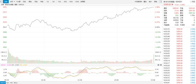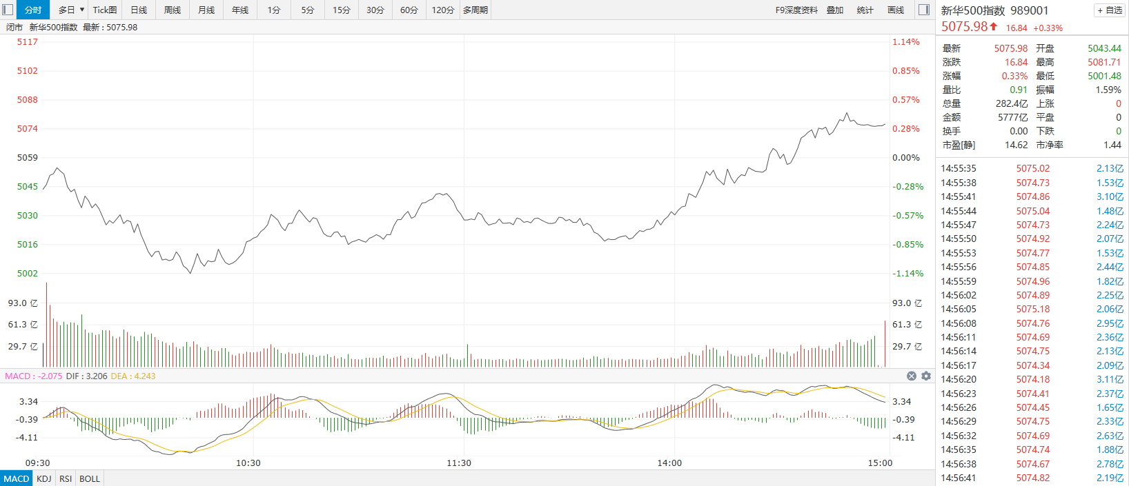 转自:新华财经 新华财经北京10月15日电(罗浩)新华500指数(989001)10月15日收盘上涨73.18点,涨幅1.46%,报 5089.83点。 指数盘中最高触及5091.50点,最低触及5001.50点,成分股全天总成交额报8200亿元,总成交额较上一 交易日显著缩量。 成分股方面,三花智控和生益科技收于约10%涨停,扬杰科技、阳光电源、华海药业、广汽集团、华大 九天、中国国航等显著上涨;锦浪科技、包钢股份、西部超导、北方稀土、联泓新科等跌幅靠前。 新华500指数由国家金融信息平台•新华财经发布,新华指数(北京)有限公司运营维护,指数度量A股 主要大中市值股票价格水平。关于新华500指数的详细信息,请参见新华财经客户端。 编辑:王媛媛 走势上看,新华500指数(989001)15日早间小幅改开,指数早盘期间整体呈冲高回落态势,午后持续 上扬,收盘时显著上涨。 ...