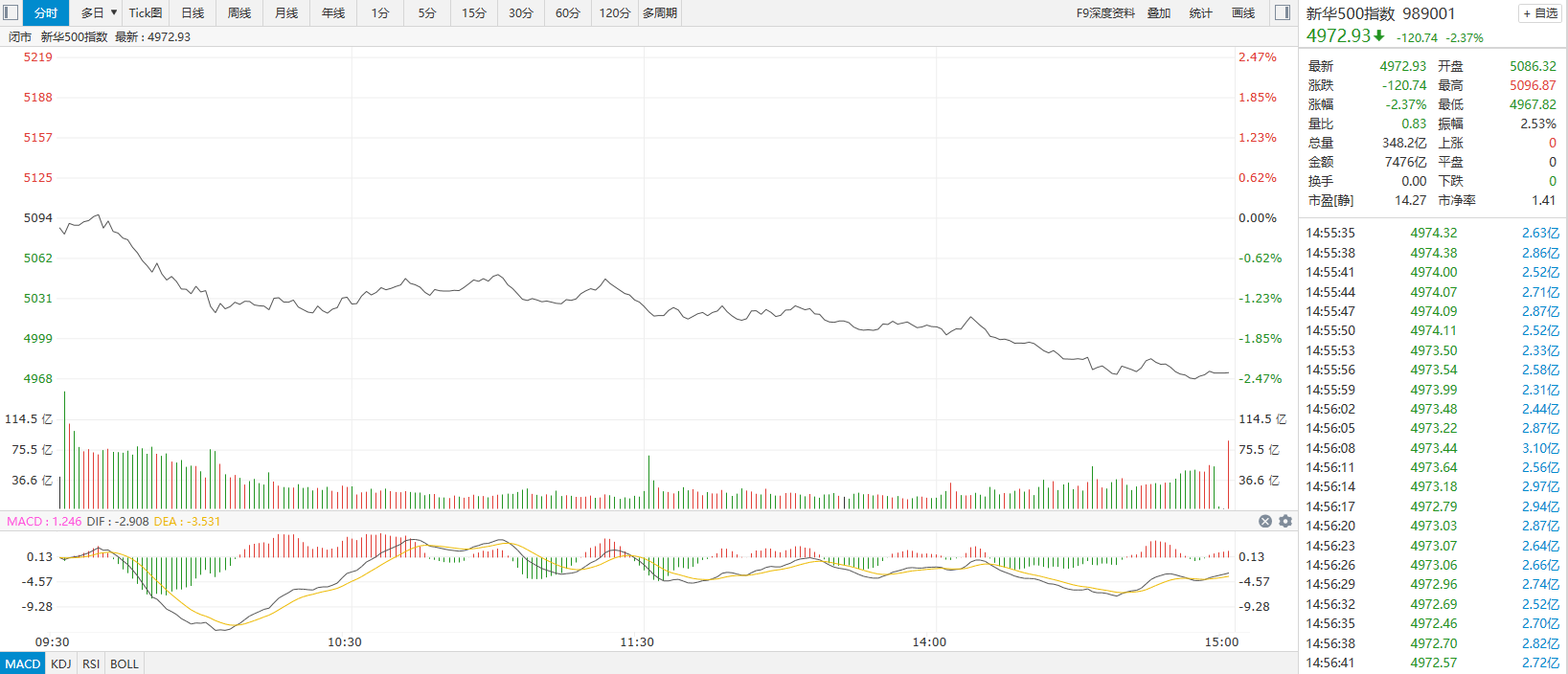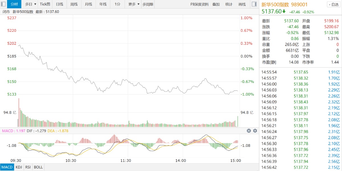 新华财经北京10月30日电(罗浩)新华500指数(989001)10月30日收盘下跌45.75点,跌幅0.87%,报5201.98点。 指数盘中最高触及5259.40点,最低触及5197.99点,成分股全天总成交额报9765亿元,总成交额较上一交易日显著放量。 成分股方面,天华新能涨14.69%,欣旺达涨10.14%,招商轮船、永兴材料、杭氧股份收于约10%涨停,天齐锂业、中远海能、多氟多涨逾6%;药明康德、 安克创新、德业股份、斯达半导、中航光电等跌幅靠前。 (文章来源:新华财经) 走势上看,新华500指数(989001)30日早间小幅低开,指数盘初完成缺口回补后有所下探,跌近0.6%后震荡反弹,此后窄幅整理,至午间收盘时小幅上 涨。指数午后出现较大幅度回落,跌近0.95%后逐渐反弹,上攻未果后震荡下行,收盘时显著下跌。 ...
