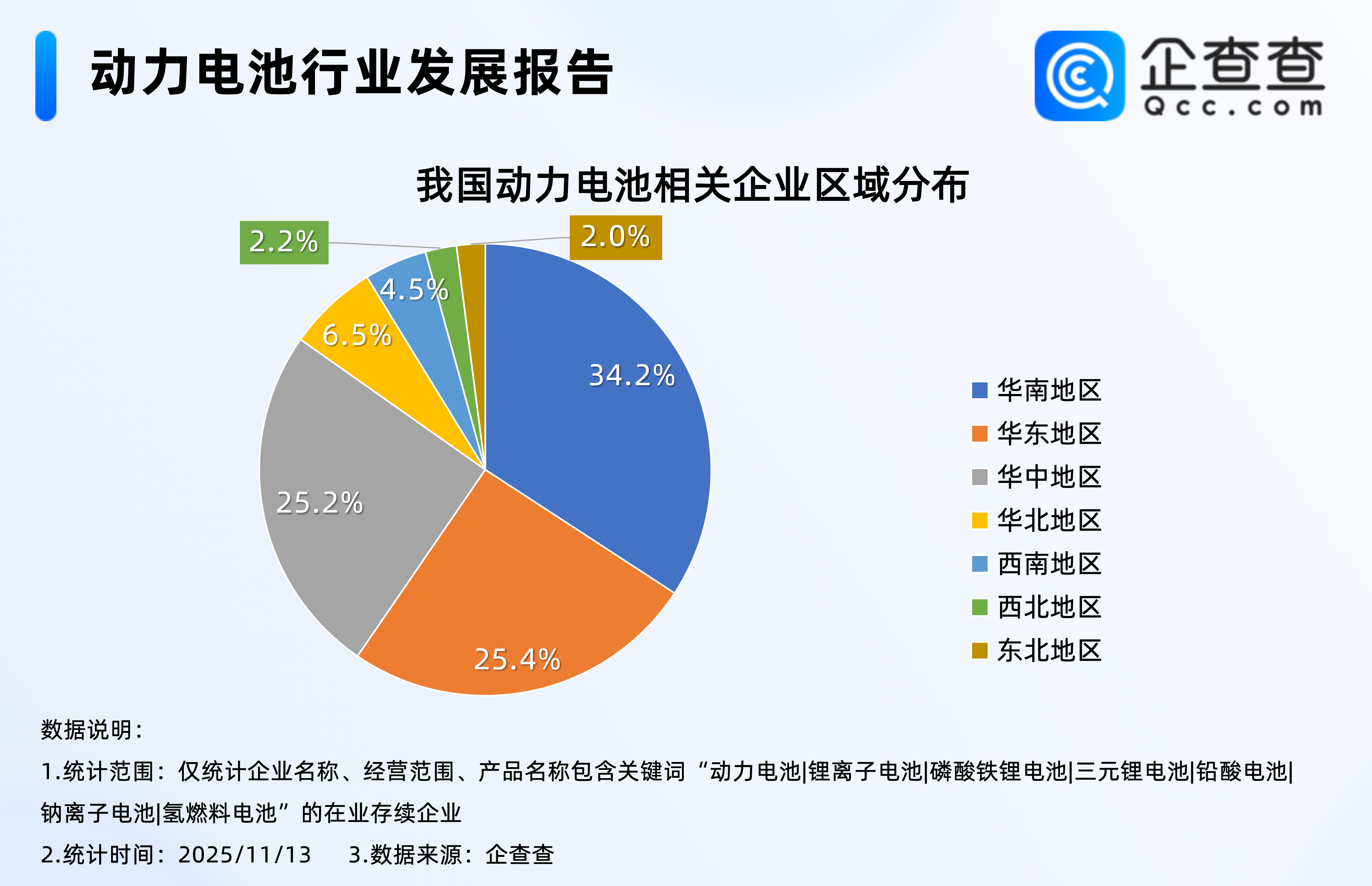 下一步将从多方面推动动力电池产业突破升级。编制"十五五"新能源汽车、新型电池产业发展规划,明确为产业发展提供指引。此外,还将扩大应用场景, 支持换电模式创新和车网互动试点。同时,我国还将研究建立动力电池碳管理政策体系。 企查查数据显示,截至11月13日,我国现存1.36万家动力电池相关企业,区域分布上华南地区最多,占比34.2%;成立年限方面,我国动力电池领域以老牌 企业为主,成立超5年的企业合计占比86.1%,其中超六成企业成立5至10年之间;注册资本方面,动力电池属重资本领域,注册资本超千万元的企业合计占 比37%以上。 1.从区域分布来看:华南地区占比34.2% 企查查数据显示,截至11月13日,我国现存1.36万家动力电池相关企业,区域分布上,华南地区最多,占比34.2%,其次是华东、华中地区,分占25.4%、 25.2%,东北地区相对最少,占比2.0%。 2.从成立年限来看:超六成企业成立于5-10年 据央视新闻,2025世界动力电池大会于11月12日在四川宜宾开幕,从大会上了解到,我国将推出动力电池"十五五"专项规划,推动新型电池产业发展。最新 数据显示,中国动力电池产业实现快速发展,关键核心技术 ...