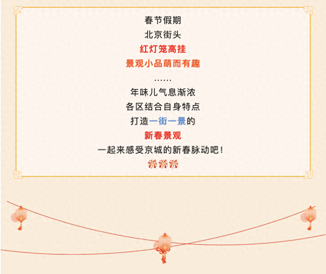 漫步万源路,"2026新年快乐"的红色球灯在火树银花间显得格外喜庆,灵 动的"爆竹"闪烁生辉,吉祥的"福袋"红光摇曳,将美好祝愿悉数传递。 春节假期 北京街头 红灯笼高挂 景观小品萌而有趣 年味儿气息渐浓 各区结合自身特点 打造一街一景的 新春景观 一起来感受京城的新春脉动吧! 举举举 01 丰台区 丽泽金融商务区主干道两侧彩灯带缠绕枝头,盏盏红灯笼随风轻摇,将街巷 勾勒得温暖而璀璨,路旁巨大的"春"字灯组格外醒目,为丽泽金融商务区增 添了新春气息。 791 Village i C 8 2026 新年快乐 方 新年出版 Arch 年快乐 2 在万源南路交汇处, 航天特色灯组格外吸睛。"航天员"端坐在星球上、手 握星光,周边星点灯带环绕,浪漫又科幻,周围树枝彩灯如繁星缠绕,彩色 星球灯垂挂其间,似硕果满枝,航天情怀与新春意趣相融共生。 年味儿藏在大街小巷的一串串红灯笼里。居民楼间挂满的红灯笼, 串起了节 日里的红火热闹。 t and the first and the latest of - 3.6- 2026 6 2018 - 20 ( � t @ g : the 45 $ �- 石景山区 02 夜幕低垂,石 ...