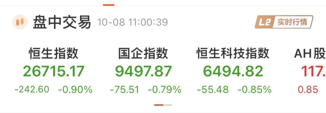 10月8日,港股市场低开低走,截至11时,恒生指数跌0.9%,报26715.17点,恒生国企指数跌0.79%,报9497.87点,恒生科技指数跌0.85%报6494.82点。 受益于黄金突破4000美元/盎司关口,黄金板块集体强势大涨。赤峰黄金盘中涨超17%,中国白银集团盘中涨超13%,紫金黄金国际涨超7%。 新股方面,长风药业今日上市,开盘涨幅达218.64%,盘中一度涨超220%。公开资料显示,长风药业香港公开发售获6697.80倍认购,成为今年8月港交所 经修订后的新股定价机制实行以来,超购倍数第二高的新股。 长风药业上市首日涨超220% 10月8日,长风药业登陆港交所,上市首日,长风药业高开超218.64%,报47港元/股,盘中一度涨超220%。截至11时03分,长风药业涨179.59%,报41.24 港元/股。 | | HK 长风药业 | | Σ | | --- | --- | --- | --- | | | 02652 L2 = | | | | 41.240 →チ | | 47.000 最高 48.800 最低 | 40.020 | | 179.59% 76.490 央手 | | 3.58% 总量 ...