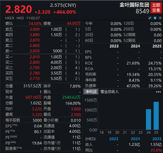 继昨日晚间暗盘分别大涨472%和181%之后,10月10日上市的两只港股新股金叶国际集团和挚达科技如 约大涨。 截至证券时报记者发稿,金叶国际集团和挚达科技的涨幅分别为464%和181%。 | | 2.820 +2.320 +464.00% | 2.575(CNY) | | | | 金叶国际集团 立即 | 8549 交易 | | --- | --- | --- | --- | --- | --- | --- | --- | | HKEX HKD 11:02:37 | | | | | | | 1 . . + | | 载 | 74.58% === | | 44.00万 | 交生 | 0.00% 120日 | | 0.00% | | 卖五 | 2.890 | 1.00万 ( | 1) | 5日 | 0.00% 250H | | 0.00% | | 卖口 | 2.880 | 1.50万 | ( 2) | 20日 | 0.00% 52周高 | | 0.00 | | 英三 | 2.870 | | - ) | 60日 | 0.00% 52周低 | | 0.00 | | 英二 | 2.860 | - | - ) | | 20 ...