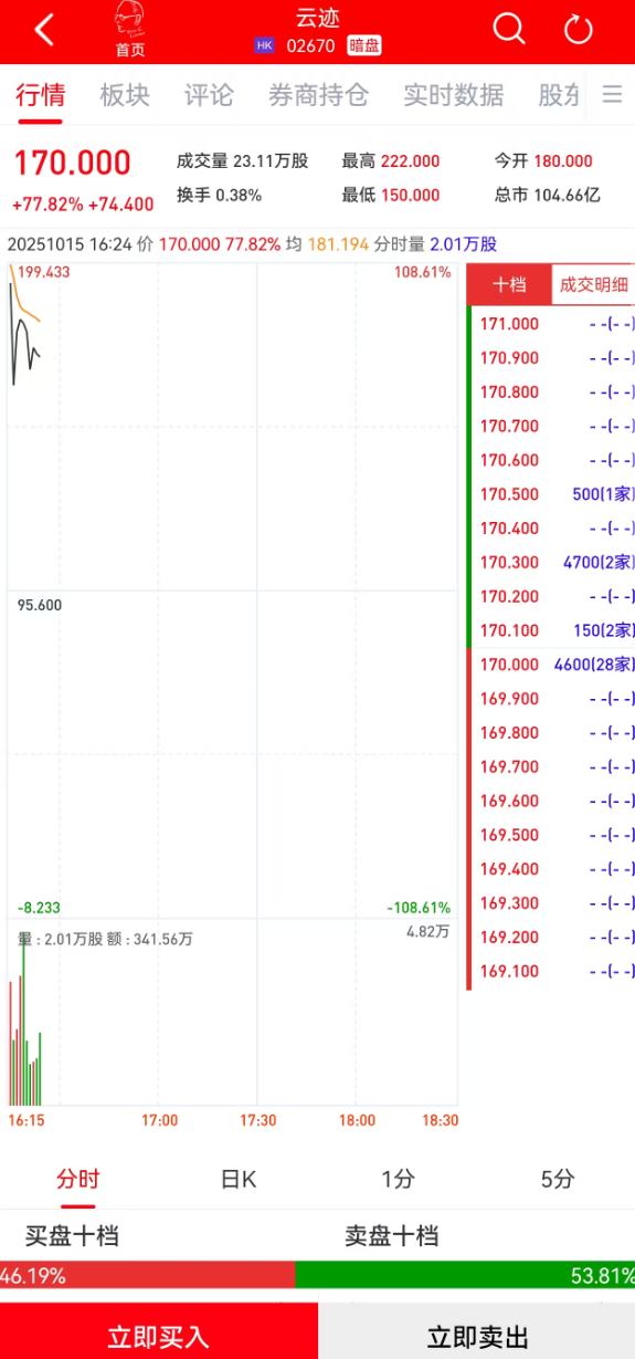 16:15 17:00 17:30 18:00 18:30 分时 1分 日K 5分 买盘十档 卖盘十档 53.81% 46.19% 立即买入 立即卖出 · 行情来源: 利弗莫尔证券 · 智通财经APP获悉,云迹(02670)将于10月16日(周四)在香港挂牌。截至发稿,利弗莫尔证券暗盘交易显 示报价170港元,较招股价95.6港元上涨77.82%,每手50股,不计手续费,每手赚3720港元。 ...