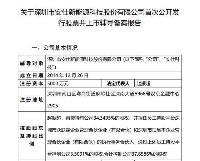 瑞财经 刘治颖 12月24日,深圳市安仕新能源科技股份有限公司(以下简称:安仕新能源)在深圳证监 局完成IPO辅导备案,拟A股上市,辅导机构为国联民生承销保荐。 安仕新能源成立于2014年,通过对锂电池全产业链深度布局,为客户提供清洁能源存储的全套服务解决 方案,市场涵盖储能、特种车辆、医疗设备、UPS、光储充等多个领域。公司注册资本为5000万元,法 定代表人为赵振超。 股东方面,赵振超,直接持有公司34.35%的股权,并担任员工持股平台深圳市众联鑫企业管理合伙企 业(有限合伙)和深圳市顶晶丰企业管理合伙企业(有限合伙)的执行事务合伙人,通过上述员工持股 平台控制公司3.51%的股权,合计控制公司37.86%的股权。 目前,赵振超担任公司董事长、经理。 | 辅导对象 | 深圳市安仕新能源科技股份有限公司 (以下简称"公司"、"安仕科 | | | | --- | --- | --- | --- | | | 技") | | | | 成立日期 | 2014年12月26日 | | | | 注册资本 | 5000 万元 | 法定代表人 | 赵振超 | | 注册地址 | 深圳市南山区粤海街道麻岭社区深南大道9968号汉 ...