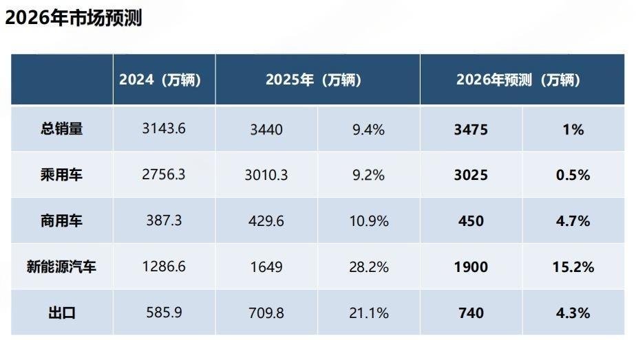 Core Viewpoint - In 2025, China's automotive production and sales are expected to exceed 34.4 million units, marking a significant growth compared to previous years, driven by the "Two New" policy and strong market demand [1][2]. Group 1: Overall Market Performance - In 2025, China's total automotive production and sales are projected to reach 34.53 million and 34.4 million units, respectively, representing year-on-year growth of 10.4% and 9.4% [1][2]. - The automotive market has maintained a scale of over 30 million units for three consecutive years, solidifying its position as the world's largest automotive market for 17 years [1][2]. - The forecast for 2026 indicates a slight increase in total automotive sales to 34.75 million units, with a year-on-year growth of 1% [2]. Group 2: Passenger Vehicle Insights - In 2025, passenger vehicle production and sales surpassed 30 million units for the first time, achieving 30.27 million and 30.1 million units, respectively, with year-on-year growth of 10.2% and 9.2% [4][8]. - The growth rate of passenger vehicle sales in December 2025 showed a decline, with production and sales dropping by 6.7% and 4.6% month-on-month, and a year-on-year decrease of 2.1% and 6.2% [4][6]. Group 3: Commercial Vehicle Performance - The commercial vehicle market in 2025 saw production and sales return to over 4 million units, with figures of 4.261 million and 4.296 million units, reflecting year-on-year growth of 12% and 10.9% [10]. - The sales of new energy commercial vehicles reached 954,000 units in 2025, marking a significant year-on-year increase of 65.5% [10]. Group 4: New Energy Vehicle Trends - In 2025, new energy vehicle production and sales reached 16.626 million and 16.49 million units, respectively, with year-on-year growth of 29% and 28.2% [14]. - New energy vehicles accounted for 47.9% of total new vehicle sales, an increase of 7 percentage points from the previous year [14][16]. - The forecast for 2026 anticipates new energy vehicle sales to reach 19 million units, representing a year-on-year growth of 15.2% [16].