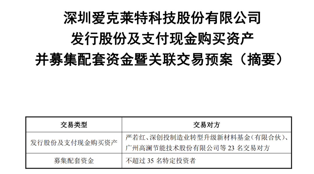 【导读】爱克股份拟以22亿元购买东莞硅翔100%股权,股票明日复牌 | 交易类型 | 交易对方 | | --- | --- | | 发行股份及支付现金购买资产 | 严若红、深创投制造业转型升级新材料基金(有限合伙)、 | | | 广州高澜节能技术股份有限公司等23 名交易对方 | | 募集配套资金 | 不超过 35 名特定投资者 | 12月2日晚间,爱克股份(300889)发布公告称,拟以22亿元购买东莞硅翔100%股权。公司股票将于12月3日(星期三)开市起复牌。 经交易各方协商,东莞硅翔100%股权的交易价格暂定为22亿元。 爱克股份表示,通过本次交易,公司将进一步强化第二增长曲线,完善新能源板块的业务链,将业务拓展至数据中心液冷领域。 经公司申请,爱克股份股票将于12月3日(星期三)开市起复牌。 拟以22亿元购买东莞硅翔100%股权 爱克股份股票复牌 12月2日晚间,爱克股份发布公告称,拟通过发行股份及支付现金的方式向严若红等23名交易对象购买东莞硅翔100%股权,并向不超过35名特定投资者发 行股份募集配套资金。 自2021年启动新能源汽车产业战略升级以来,爱克股份通过"资本+技术"双轨驱动持续深化产 ...