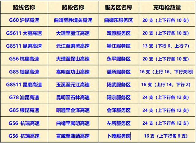 智通财经记者 熊强 提醒建议各位返程新能源车主预留续航里程提前量,并及时通过导航地图和各类充电APP、小程序关注 沿途服务区充电桩空闲情况,做好充电计划。 智通财经从云南省交通运输厅获悉,2月21日,春节假期进入最后3天返程期,预计高速公路充电繁忙服 务区主要集中于滇中方向G60沪昆高速(曲靖东服务区)、G85银昆高速(潘所服务区)、滇西北方向 G5611大丽高速(双廊服务区)、G56杭瑞高速(永平服务区)、滇西南方向G8511昆磨高速(墨江服 务区)等。 2026年春节假期返程高速公路充电繁忙服务区预测如下: | 路线名称 | 路段名称 | 服务区名称 | 充电枪数量 | | --- | --- | --- | --- | | G60 沪昆高速 | 曲靖至胜境关高速 | 曲靖东服务区 | 20 支(上下行各 10 支) | | G5611 大丽高速 | 大理 到 mi 高速 | 双廊服务区 | 20 支(上下行各 10 支) | | G8511 昆磨高速 | 元江至磨黑高速 | 墨江服务区 | 13 支(下行6,上行7) | | G56 杭瑞高速 | 大理至保山高速 | 永平服务区 | 20 支(上下行各 ...