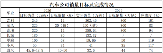 曾几何时,中国汽车市场尤其新能源车型的高歌猛进,让不少制造商在制定年度目标时动辄以倍数设定 增长标杆,仿佛上涨曲线永远陡峭,市场容量永无边界。 | | | 汽车公司销量目标及完成情况 | | | | | --- | --- | --- | --- | --- | --- | | 车企 | 2026 | | 2025 | | | | | 目标销量(万辆)目标增幅(%) | | 实际销量(万辆) | 目标销量(万辆) | 完成度(%) | | 吉利 | 345 | 14 | 302. 46 | 300 | 101 | | 东风 | 325 | 30(估) | 250(估) | 300 | 83 | | 奇瑞 | 320 | 14 | 280. 64 | 300 | dat | | 长城 | 180 | 36 | 132. 37 | | | | 零跑 | 100 | 68 | 59. 66 | 50 | llə | | 小米 | 55 | 34 | 41 | 35 | 117 | | 蔚来 | 45.6-48.9 | 40-50 | 32.6 | 44 | 74 | 数据来源:车企公告 超额完成2025全年销量目标 ...