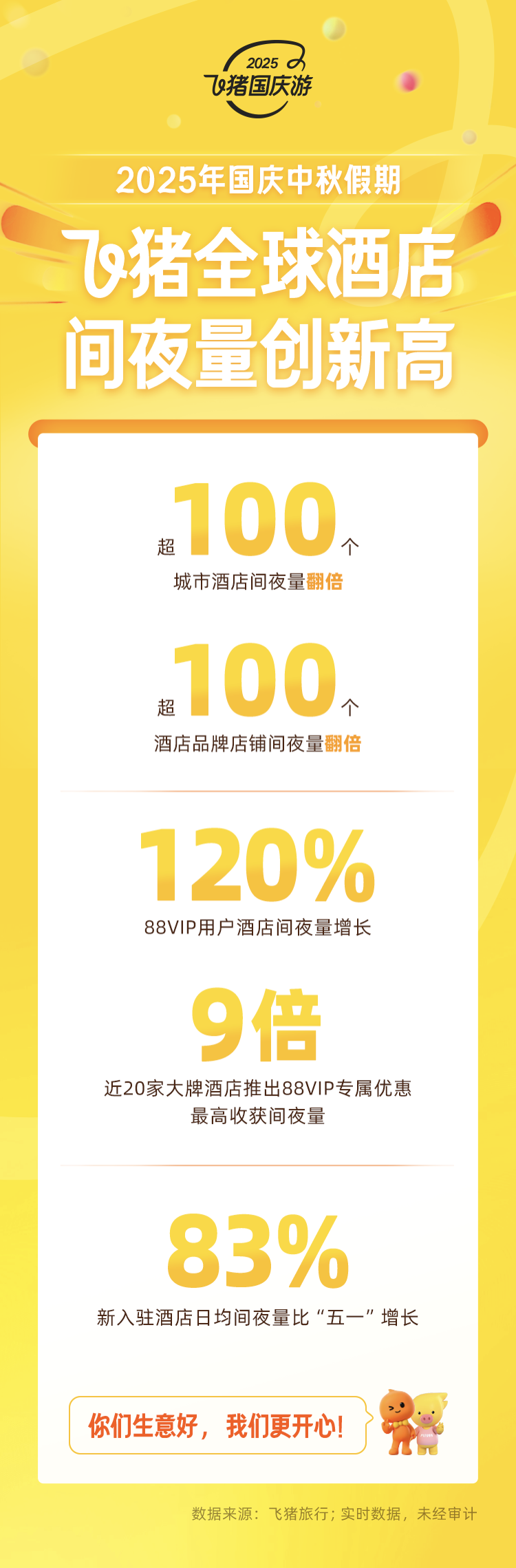 10月10日,飞猪公布2025年国庆中秋假期数据:整体预订金额同比增长48%,预订人次同比增长30%,倍 数级领涨旅游市场。其中,全球酒店预订规模创下历史新高,间夜量同比去年大幅增长78%,全国超过100 个城市的酒店间夜量翻倍。 ← 超 酒店品牌店铺间夜量翻倍 受到供需结构、极端天气等因素影响,今年旅企经营依然承压。以酒店为例,酒店信息统计机构STR数据 显示,今年上半年行业整体平均每间可售客房收入(RevPAR)同比下降5%,入住率和平均房价也双双下 滑。面对长假旺季,行业竞争更加激烈。 而纵观酒店实际成交情况,商家今年十一在飞猪 "量质齐升"。除了订单规模增速大幅领先市场外,酒店平 均房价(ADR)持续增长。 今年6月23日,阿里巴巴集团宣布饿了么、飞猪进入阿里中国电商事业群,饿了么、飞猪继续保持公司化 管理模式,业务决策执行上与中国电商事业群集中目标、统一作战。 88VIP用户酒店间夜量增长 近20家大牌酒店推出88VIP专属优惠 最高收获间夜量 l 新入驻酒店日均间夜量比"五一" 增长 E意好,我们更开 增势带动一批酒店商家在飞猪平台收获生意新增量。飞猪数据显示,超100个酒店品牌店铺间夜量至少翻 ...