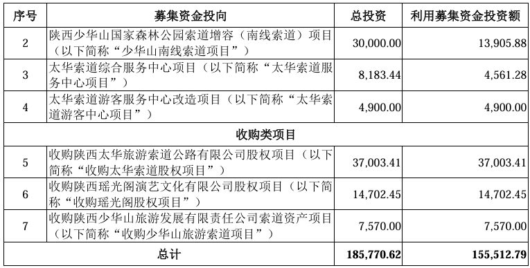 其中,旅游演艺方面,陕西旅游打造了中国首部大型实景历史舞剧《长恨歌》、大型红色实景演艺《泰山烽 火》等旅游演艺作品;在旅游索道业务方面,公司于华山景区建设和运营了西峰索道及华威滑道等项目;在 旅游餐饮业务方面,其下属剧院式餐厅唐乐宫有以"仿唐歌舞+宫廷晚宴"为特色经营模式的项目。 【大河财立方消息】11月21日,证监会发布批复,同意陕西旅游文化产业股份有限公司(简称陕西旅游)首 次公开发行股票的注册申请。 据悉,陕西旅游拟在上交所主板上市。此次拟公开发行股票的数量不超过1933.33万股,占发行后总股本的比 例不低于25%;本次发行全部为新股发行,不涉及公司原有股东公开发售股份。 拟募集资金15.55亿元,分别用于泰山秀城(二期)建设项目、陕西少华山国家森林公园索道增容、收购陕西 太华旅游索道公路有限公司股权项目等。 | 序号 | 募集资金投向 | 总投资 | 利用募集资金投资额 | | --- | --- | --- | --- | | 2 | 陕西少华山国家森林公园索道增容(南线索道)项目 | 30.000.00 | 13.905.88 | | | (以下简称"少华山南线索道项目") | | | | 3 ...