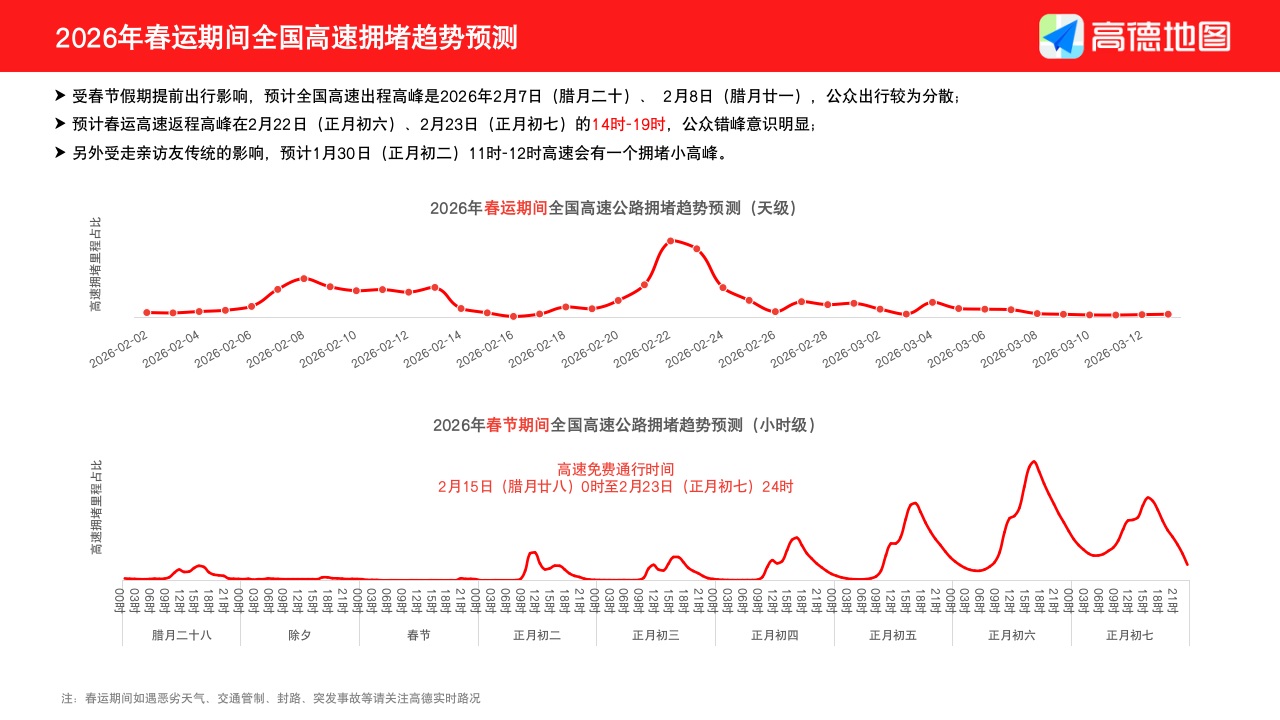 2月2日,2026年春运大幕正式拉开。根据交通运输部预测,今年春运40天全社会跨区域人员流动总量将创历史同期新高,预计有望达到95亿人次。在此背景 下,高德发布《2026年春运出行预测报告》,通过数据洞察为公众的春运出行、安全规划和旅行决策提供参考。 出行规划:高峰集中,避开重点拥堵路段与枢纽 报告预测,今年春运出行将呈现节前节后"双高峰"形态。节前出程高峰预计在2月7日、2月8日(腊月二十、腊月二十一),而节后返程高峰则预计出现在2 月22日、2月23日(正月初六、初七)下午。此外,受传统走亲访友习惯影响,正月初二(2月18日)中午时段或将出现短暂的拥堵小高峰。 值得注意的是,部分高速路段在节前易成为"堵点"。高德地图大数据显示,G60沪昆高速衢州段预计拥堵最为严重,平均车速或低至23公里/小时。高德地图 提醒广大车主,合理安排出行计划,出发前请密切关注实时路况,并注意劳逸结合,避免疲劳驾驶。 除了高速公路,部分交通枢纽周边的道路交通压力也不容小觑。报告预测,春节期间,许昌站、珠海站、桂林站、徐州站、驻马店站等火车站周边易出现拥 堵。春节期间前往交通枢纽的旅客,可以提前规划好路线,预留充足时间,以免耽误行程 ...