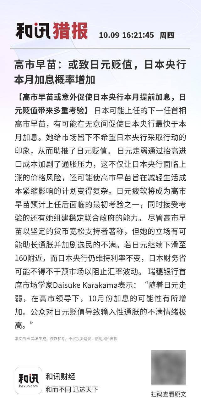 【高市早苗或意外促使日本央行本月提前加息,日元贬值带来多重考验】日本可能上任的下一任首相高 市早苗,有可能在无意间促使日本央行最快于本月加息。她给市场留下不希望日本央行采取行动的印 象,从而助推了日元贬值。 日元走弱通过抬高进口成本加剧了通胀压力,这不仅让日本央行面临上涨 的价格风险,还可能使高市早苗旨在减轻生活成本紧缩影响的计划变得复杂。日元疲软将成为高市早苗 预计上任后面临的最初考验之一,同时接受考验的还有她组建稳定联合政府的能力。 尽管高市早苗以 坚定的货币宽松支持者著称,但她的立场有可能助长通胀并加剧选民的不满。若日元继续下滑至160附 近,而日本央行仍维持利率不变,日本财务省可能不得不干预市场以阻止汇率波动。 瑞穗银行首席市 场学家Daisuke Karakama表示:"随着日元走弱,在高市领导下,10月份加息的可能性有所增加。公众 对日元贬值导致输入性通胀的不满情绪极高。" 本文由 AI 算法生成,仅作参考,不涉投资建议,使用风险自担 160附近,而日本共行1月维持利举个受,日本财务省 可能不得不干预市场以阻止汇率波动。瑞穗银行首 席市场学家Daisuke Karakama表示:"随着日元走 弱, ...