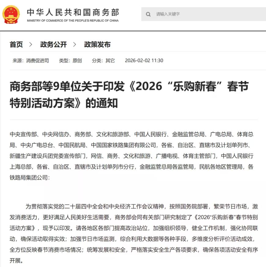 智通财经APP获悉,2月2日,商务部等9单位发布关于印发《2026"乐购新春"春节特别活动方案》的通 知。其中提出,加大金融支持。鼓励金融机构与重点商户合作,策划春节专属活动,推出消费红包、消 费立减等优惠,扩大活动覆盖面。结合地方促消费活动,推出支付满减、积分抵现等优惠措施,鼓励使 用数字人民币智能合约消费红包。充分满足小额现金需求,加强手机红包技术保障。金融机构保障适量 网点开门营业,满足群众金融服务需求。 商务部等9单位关于印发《2026"乐购新春"春节特别活动方案》的通知 中央宣传部、中央网信办、商务部、文化和旅游部、中国人民银行、金融监管总局、广电总局、体育总 局、中央广电总台、中国民航局、中国国家铁路集团有限公司,各省、自治区、直辖市及计划单列市、 新疆生产建设兵团党委宣传部门,网信、商务、文化和旅游、广播电视、体育主管部门,中国人民银行 上海总部,各省、自治区、直辖市及计划单列市分行,金融监管总局各监管局,民航各地区管理局,各 铁路局集团公司: 为贯彻落实党的二十届四中全会和中央经济工作会议精神,按照国务院部署,繁荣节日市场,激发消费 活力,更好满足人民美好生活需要,商务部会同有关部门研究制定了 ...