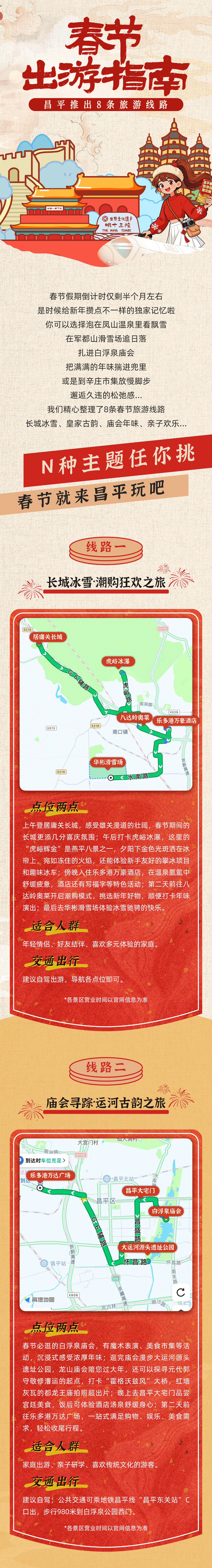 昌 平 推 出 8 条 旅 游 线 路 > 世界女化遗产 明十三陸 游 THE MING TOMBS 春节假期倒计时仅剩半个月左右 是时候给新年攒点不一样的独家记忆啦 你可以选择泡在凤山温泉里看飘雪 在军都山滑雪场追日落 扎进白浮泉庙会 把满满的年味揣进兜里 或是到辛庄市集放慢脚步 邂逅久违的松弛感 ... 我们精心整理了8条春节旅游线路 长城冰雪、皇家古韵、庙会年味、亲子欢乐 ... N种主题任你挑 春节就来昌平玩吧 线 紫 长城冰雪·潮购狂欢之旅 7 居庸关长城 席峪冰瀑 乐多港万豪酒店 华彬滑雪场 位两点 上午登居庸关长城,感受雄关漫道的壮阔,春节期间的 长城更添几分喜庆氛围;午后打卡虎峪冰瀑,这里的 "虎峪辉金"是燕平八景之一,夕阳下金色光斑洒在冰 帘上,宛如冻住的火焰,还能体验新手友好的攀冰项目 和趣味冰车;傍晚入住乐多港万豪酒店,在温泉氨盒中 舒缓疲惫,酒店还有写福字等特色活动;第二天前往八 达岭奥莱开启潮购模式,挑选新年好物,顺便打卡年味 演出;最后去华彬滑雪场体验冰雪驰骋的快乐。 年轻情侣、好友结伴、喜欢多元体验的家庭。 交通出行 建议自驾出游,导航各点位即可。 *各景区营业时间以官网信息为准 ...